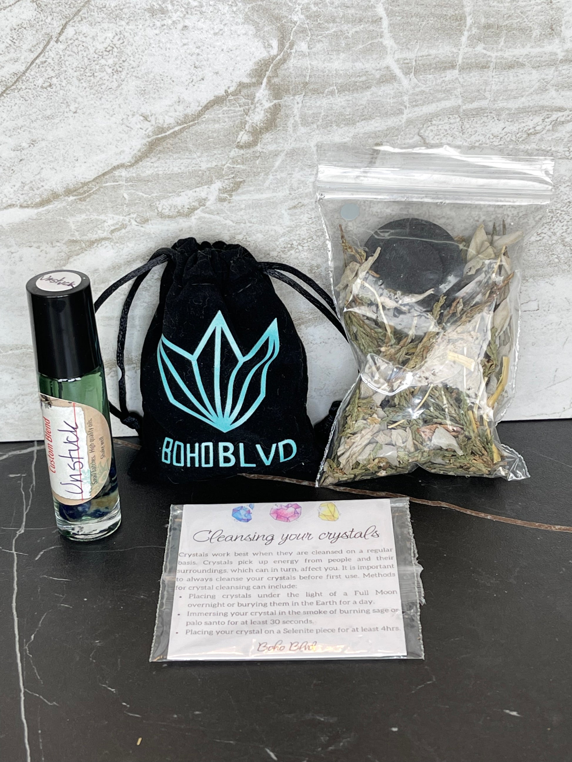 Addictions kit. This kit includes 5 crystals, hand made curated loose smudge,  informational cards and custom essential oil. This kit helps with sobriety, and even things like quitting smoking or other bad habits.  The essential oil, Unstuck, helps lift you out of being overwhelmed or stuck and brings order to chaos.