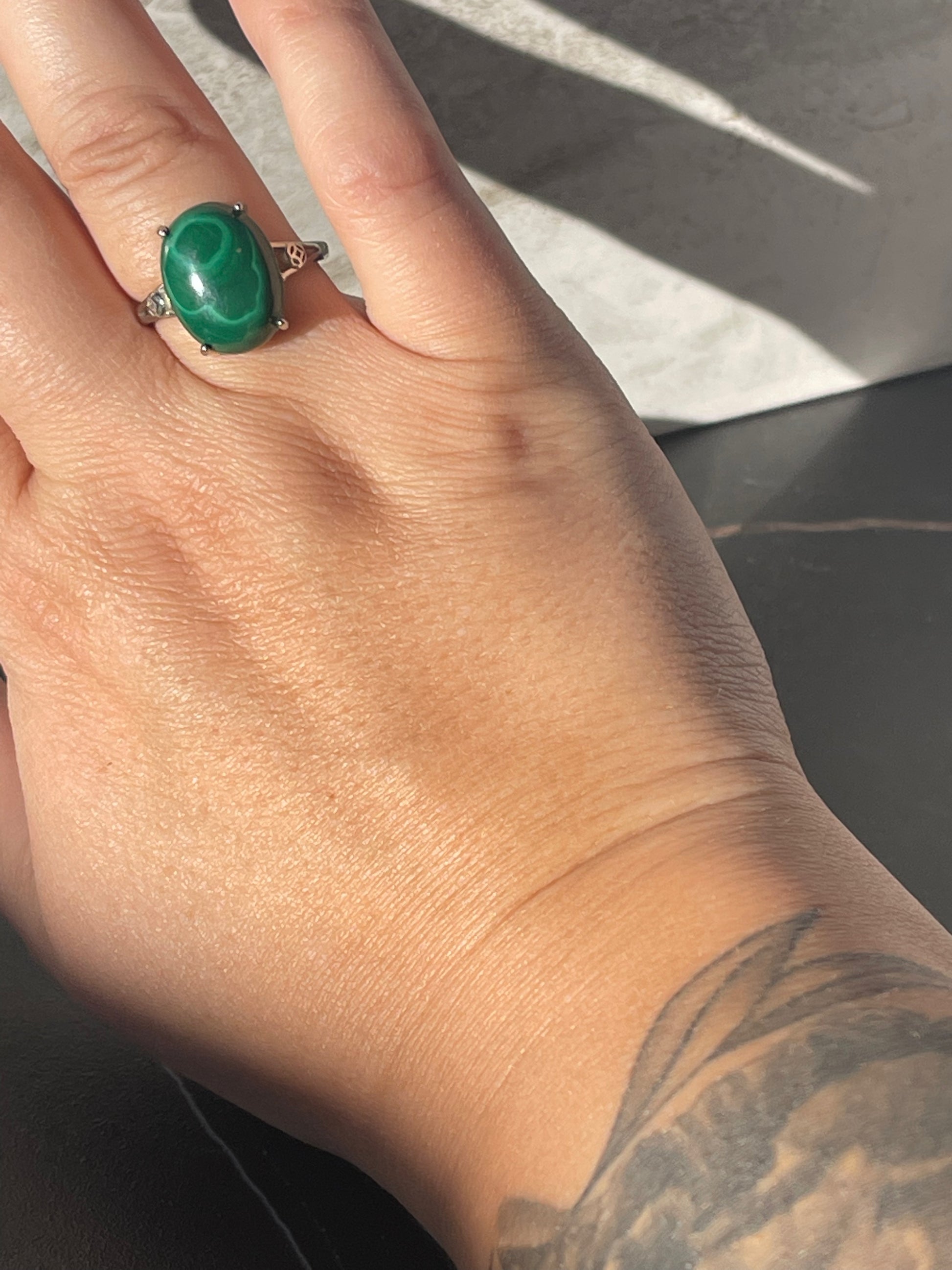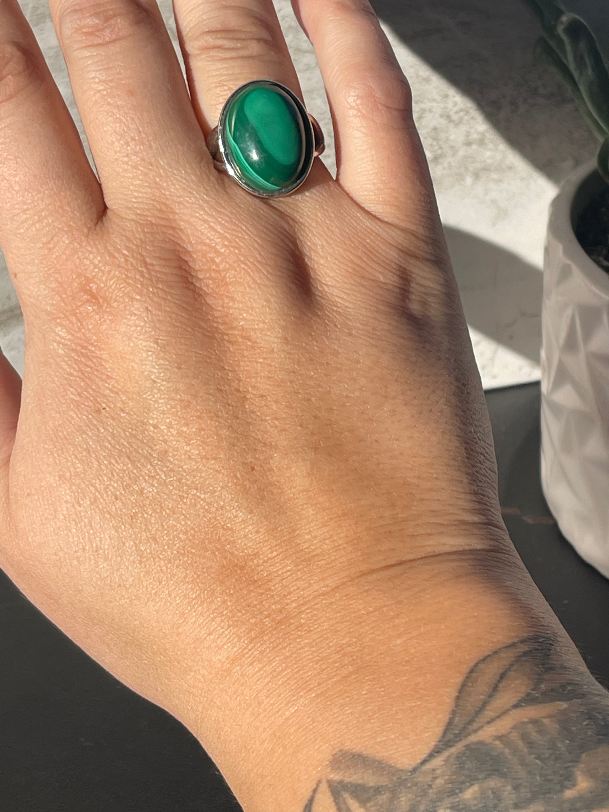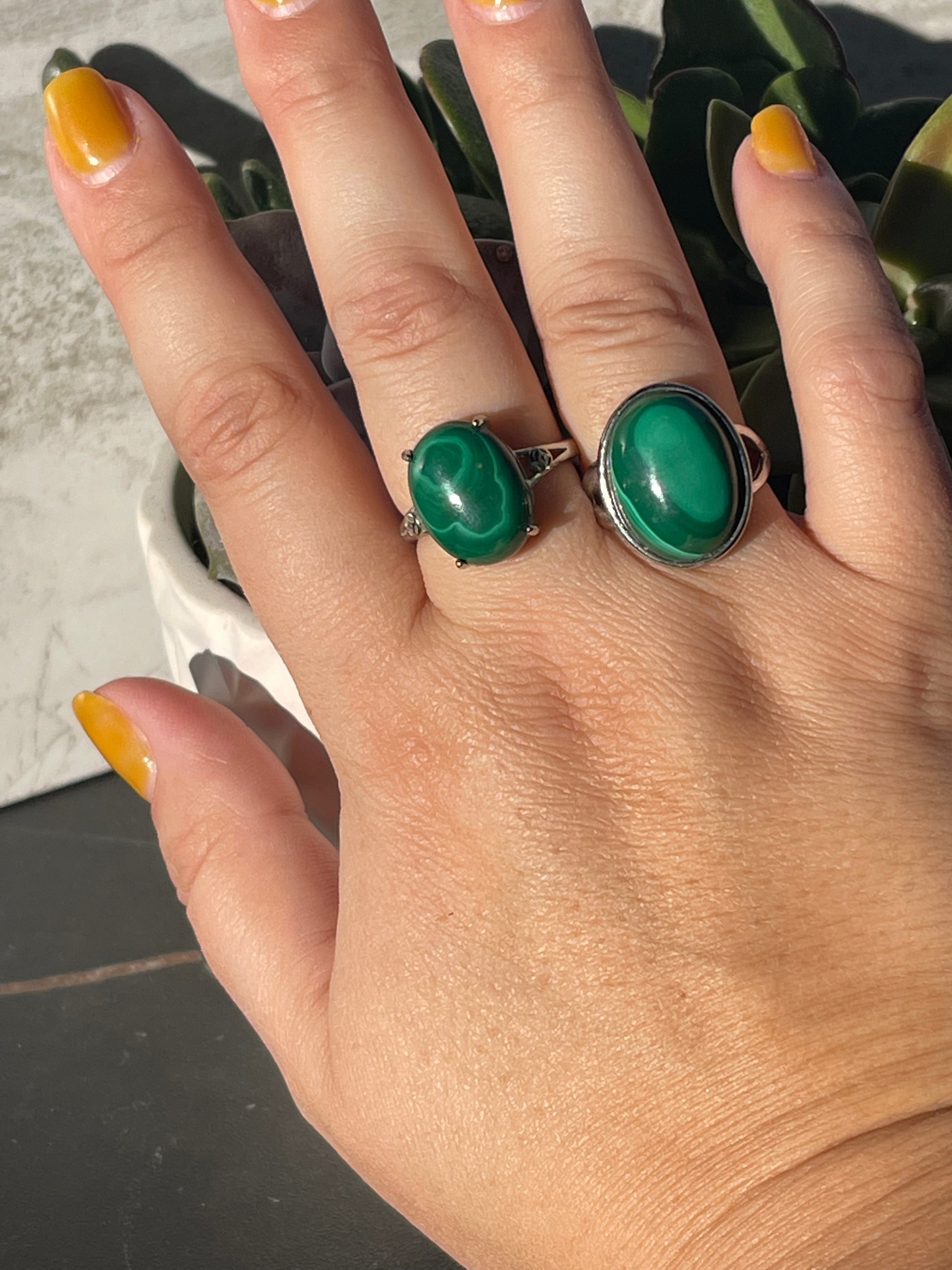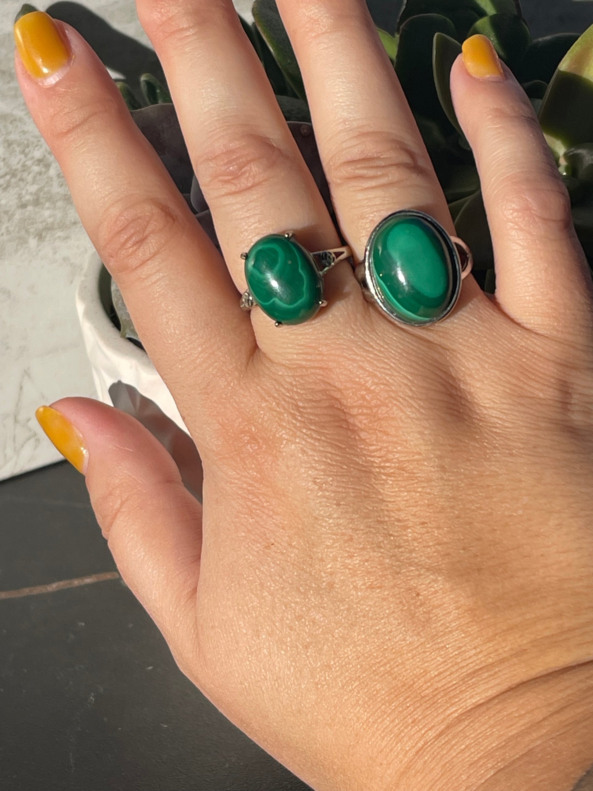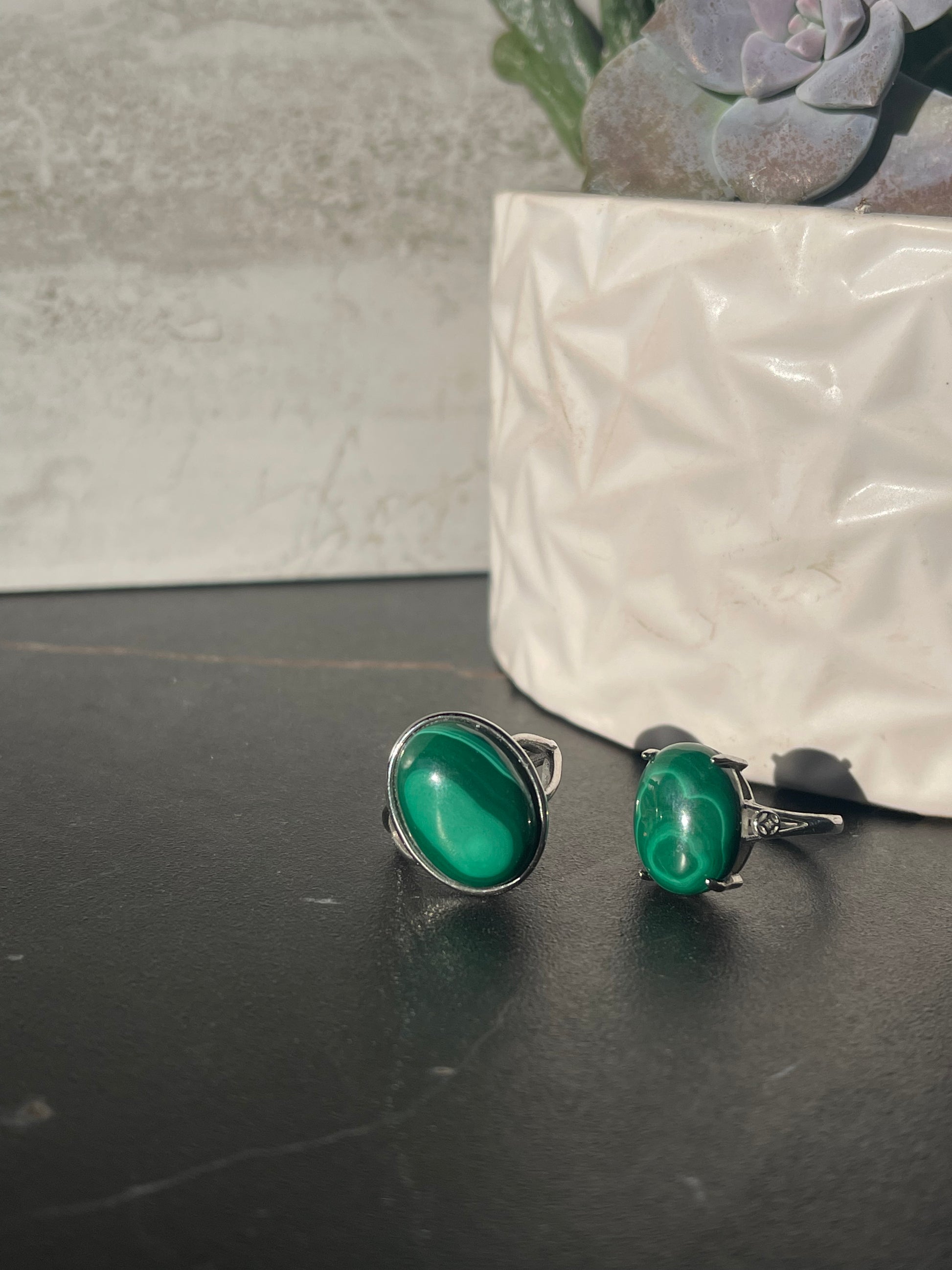 These rings are adjustable to fit you, they are silver plated with gorgeous malachite stones in them.