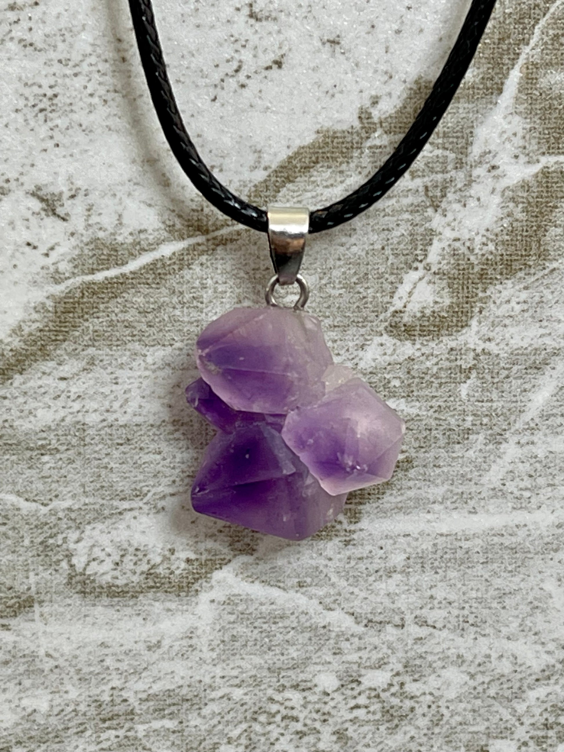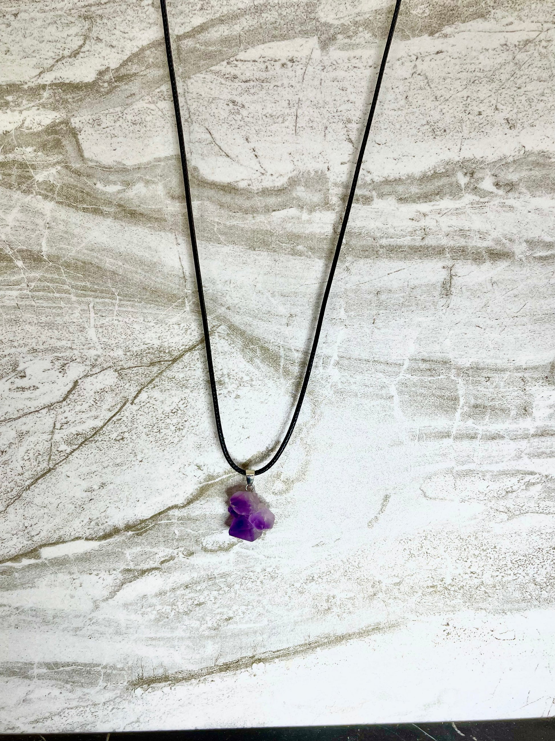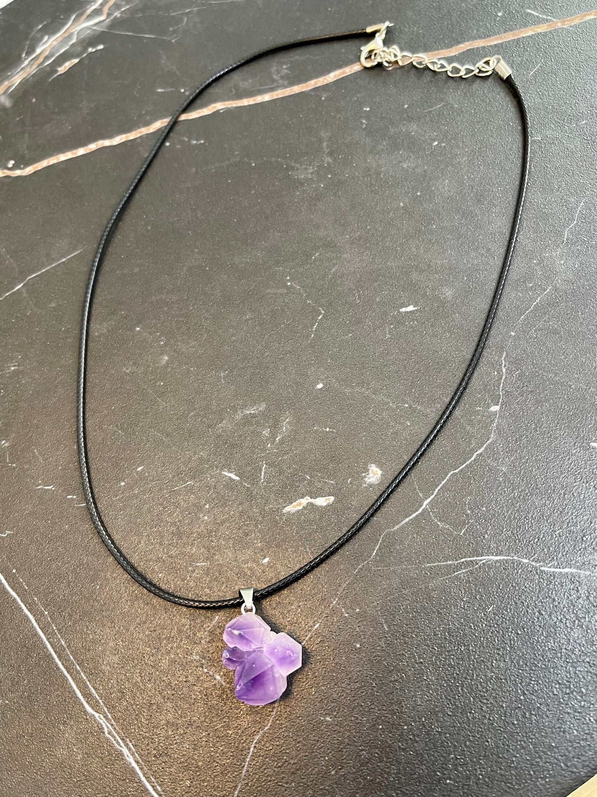 This stunning Amethyst Cluster Necklace is sure to make a statement. This necklace features an adjustable chain on the cord to fit any neckline and adds an elegant touch to any outfit. Get ready to sparkle in this beautiful jewelry piece.