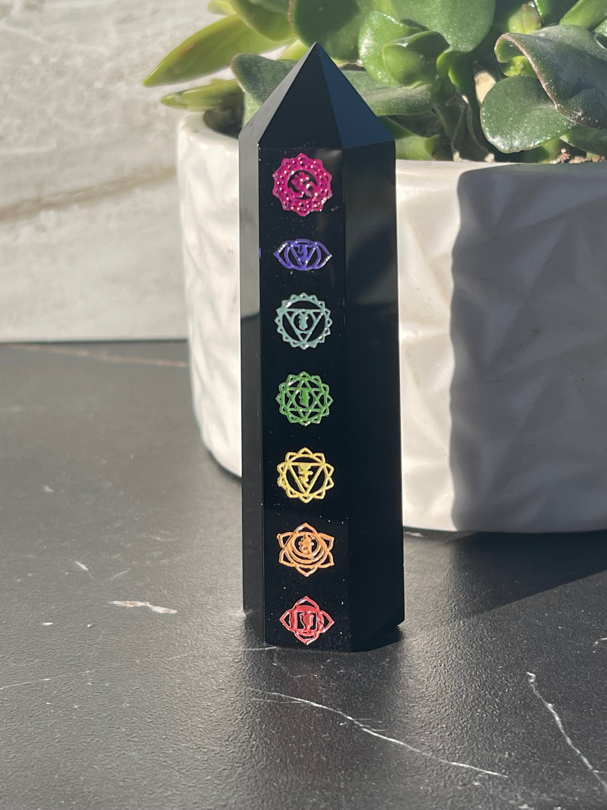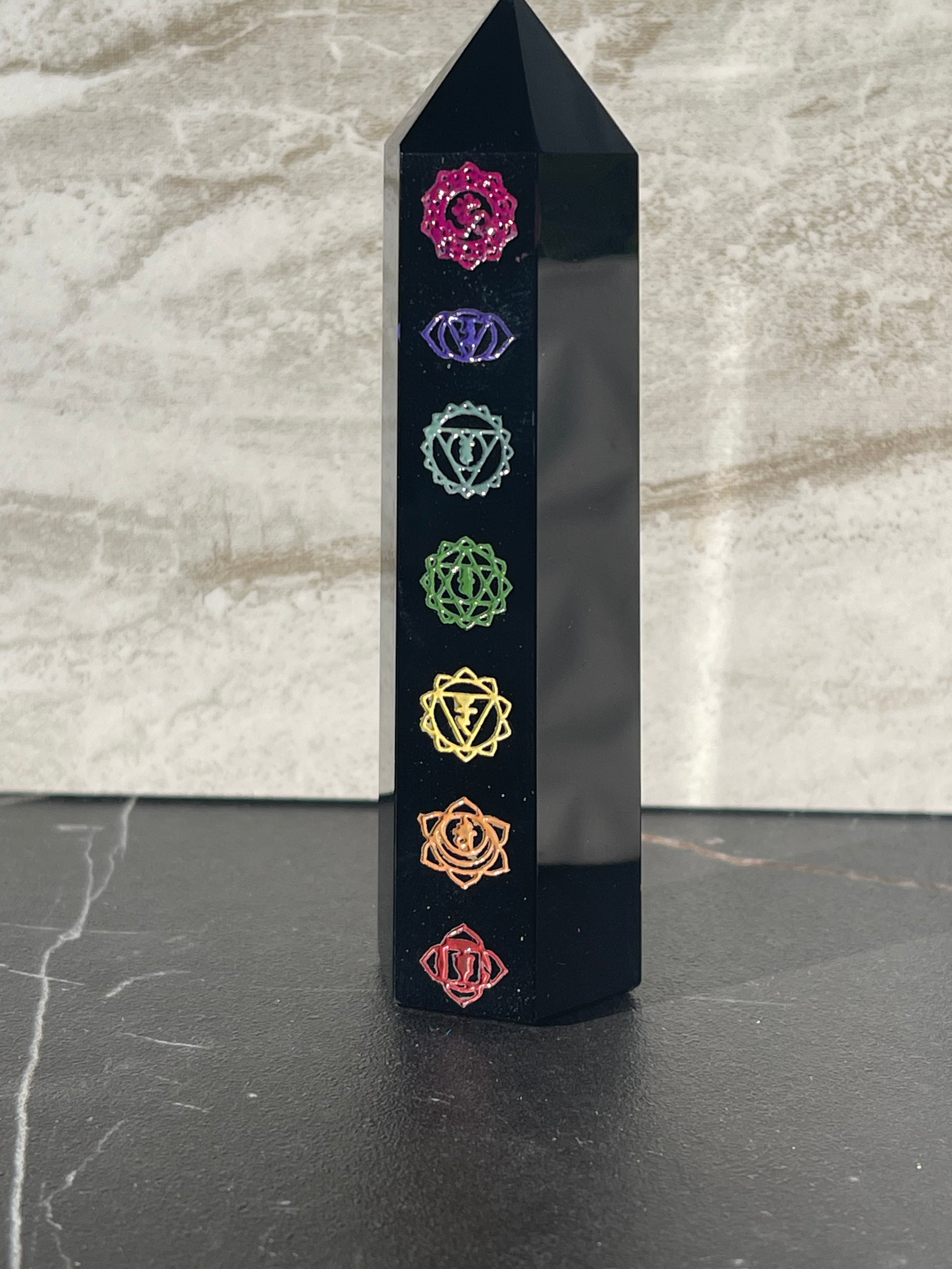 This beautiful shiny black onyx has all the main chakras carved into them with their corresponding colors.  What a great way to remember to take time to center each part of you.  And perfect to meditate with.