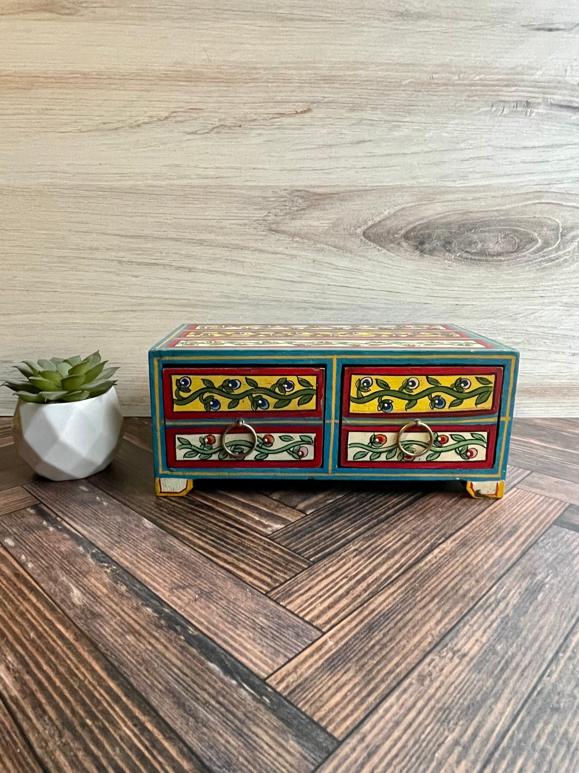 This stylishly eclectic Boho Wooden Jewelry Box adds a touch of bohemian flair to any home. Hand painted in vibrant colors, this storage box is crafted from quality wood. Showcase your accessories in style with this one-of-a-kind jewelry box.