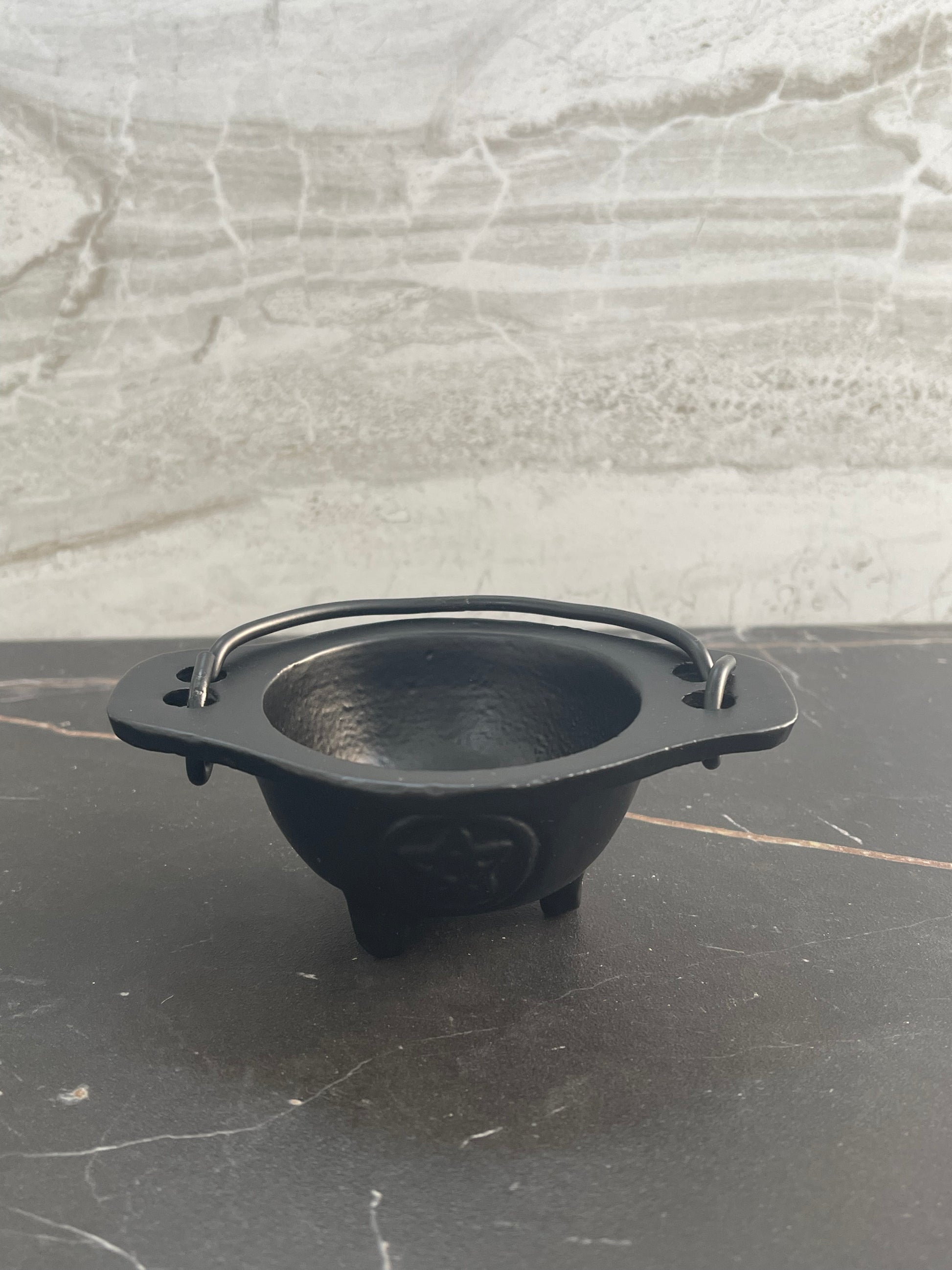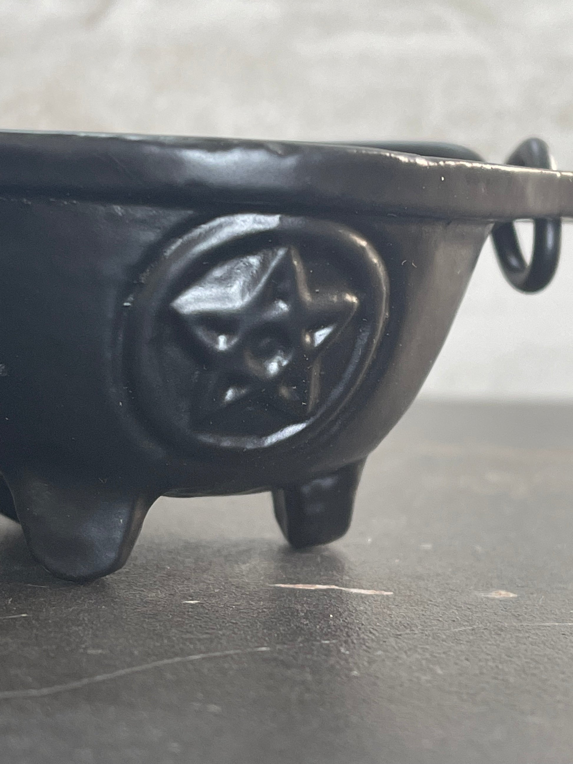 This Cast Iron Cauldron with Pentagram is the perfect tool for your wicca rituals. Made of heavy-gauge cast iron, it serves as an offering bowl or decorative piece. The intricate pentagram design offers spiritual protection and will enhance your rituals.