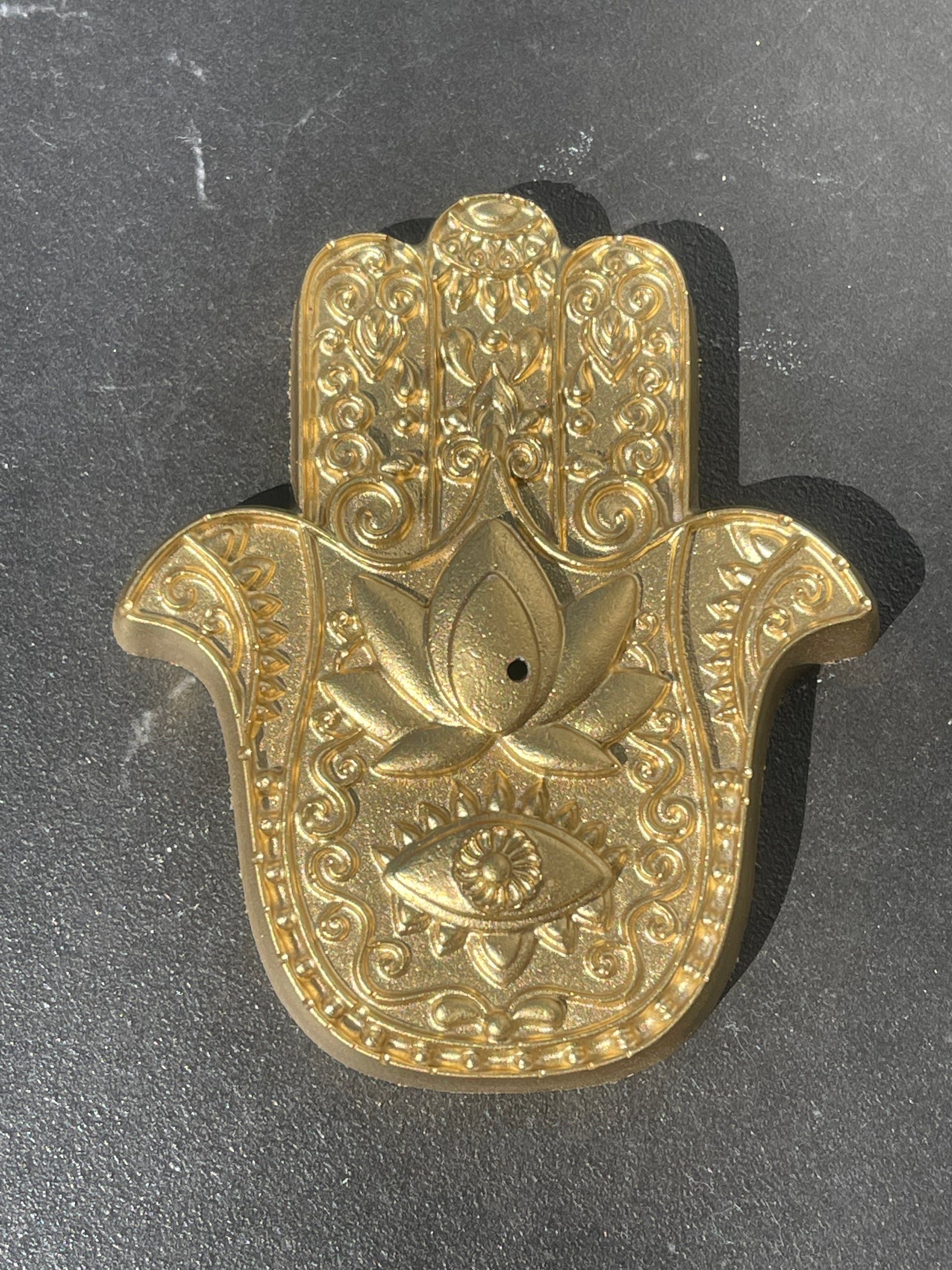 Hand casted with white Portland cement and sprayed with a top coat of either clear matte or gold.  If you would prefer as an accent instead of incense holder just comment first and you will revive one without a hole.