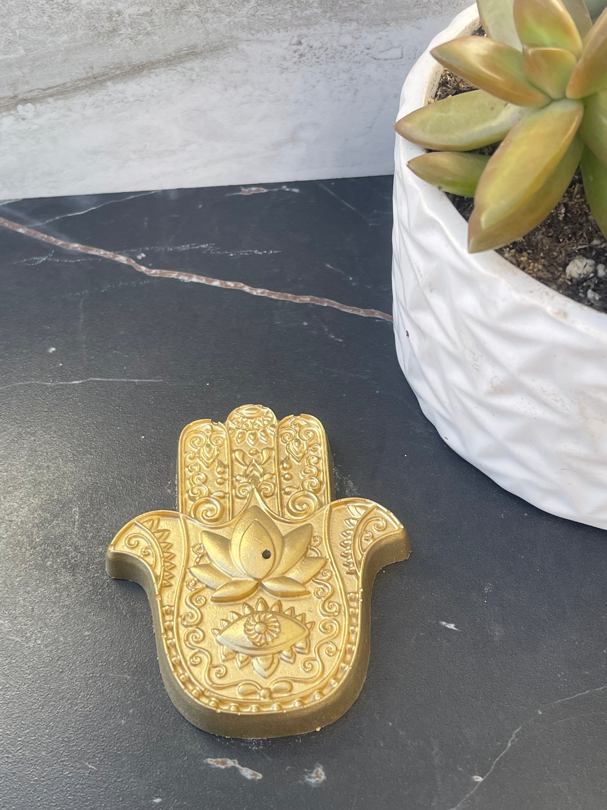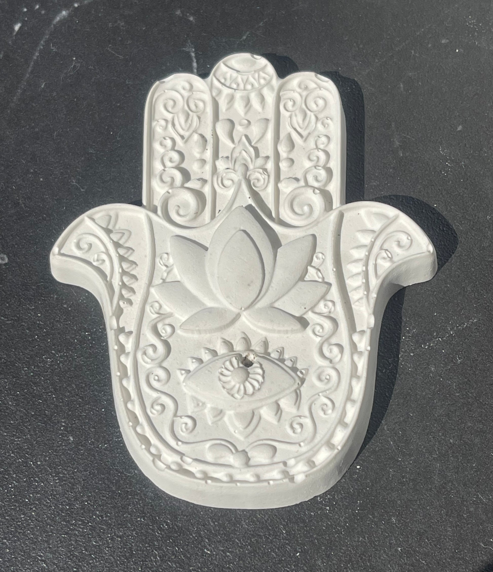 The word “hamsa” is derived from the five fingers on the hand. It is often decorated with the “evil eye” which is thought to ward off any harm or danger. The hamsa is meant to be displayed or worn with the fingers facing down to offer the proper protection, and bring luck and strength.