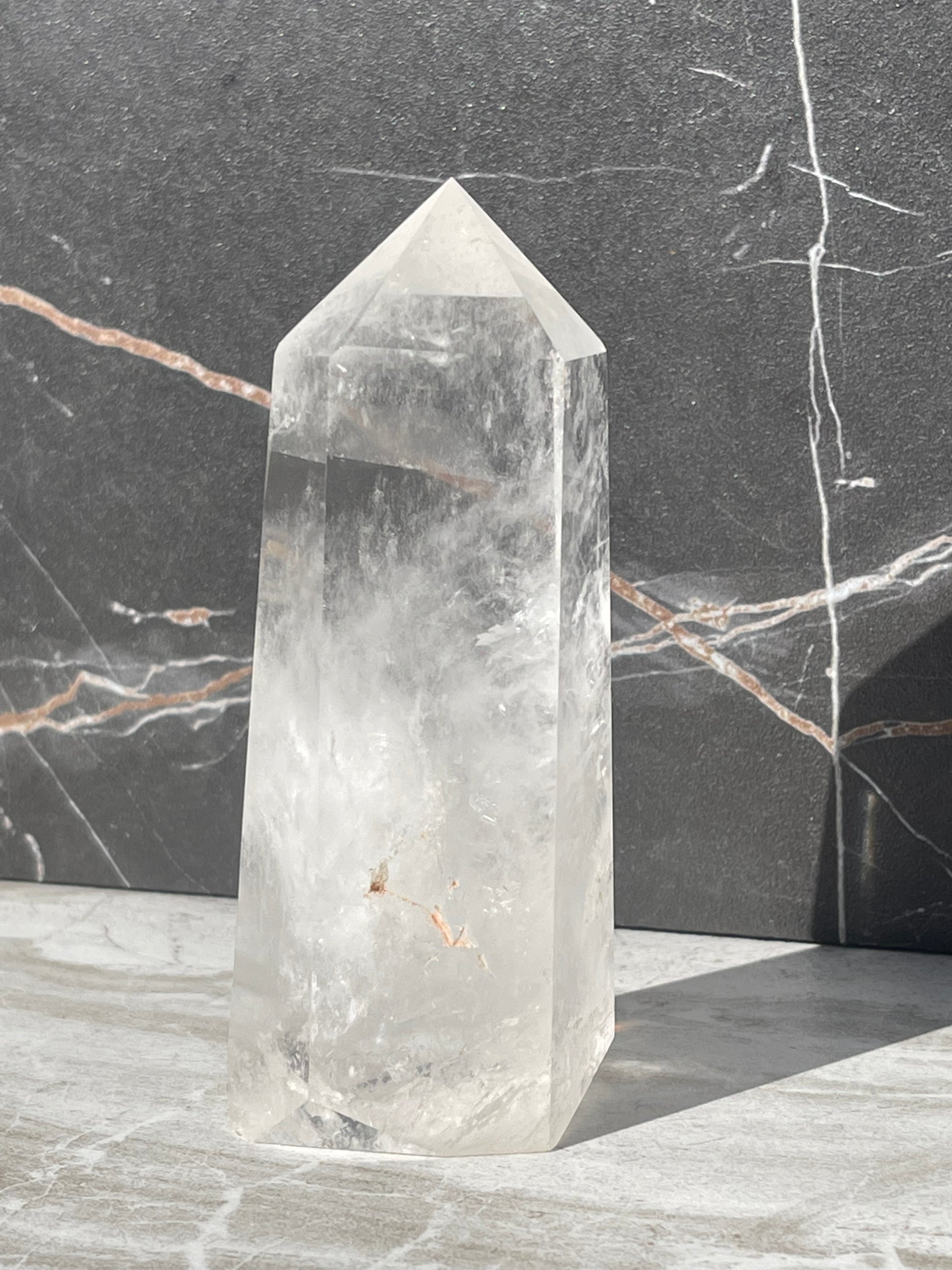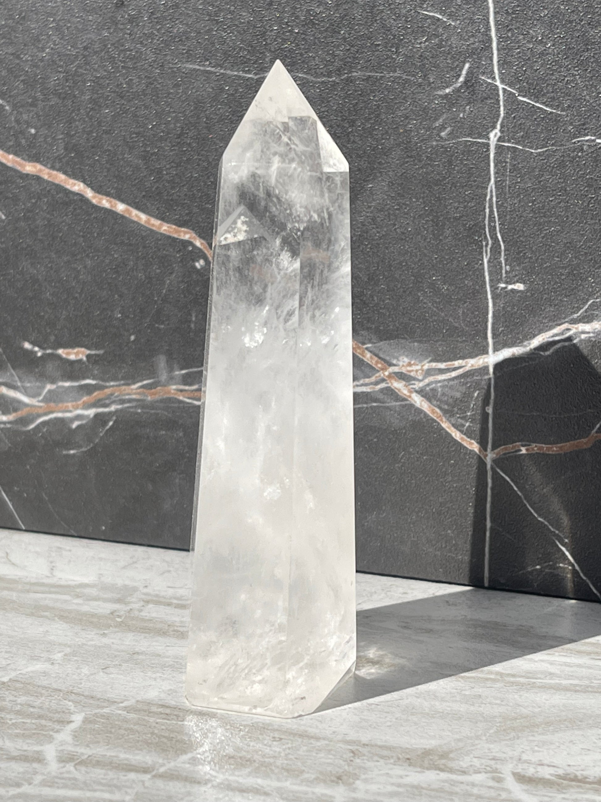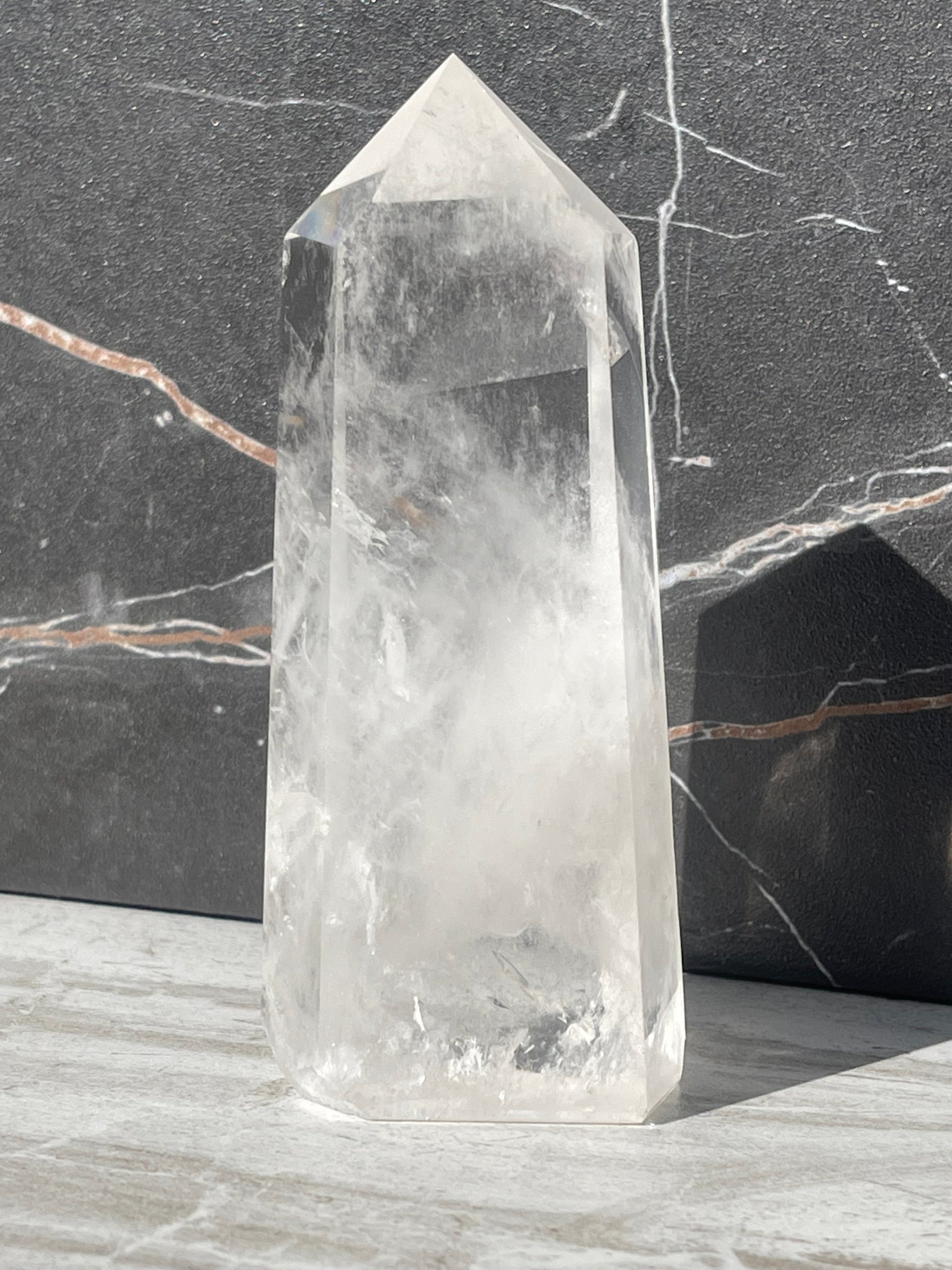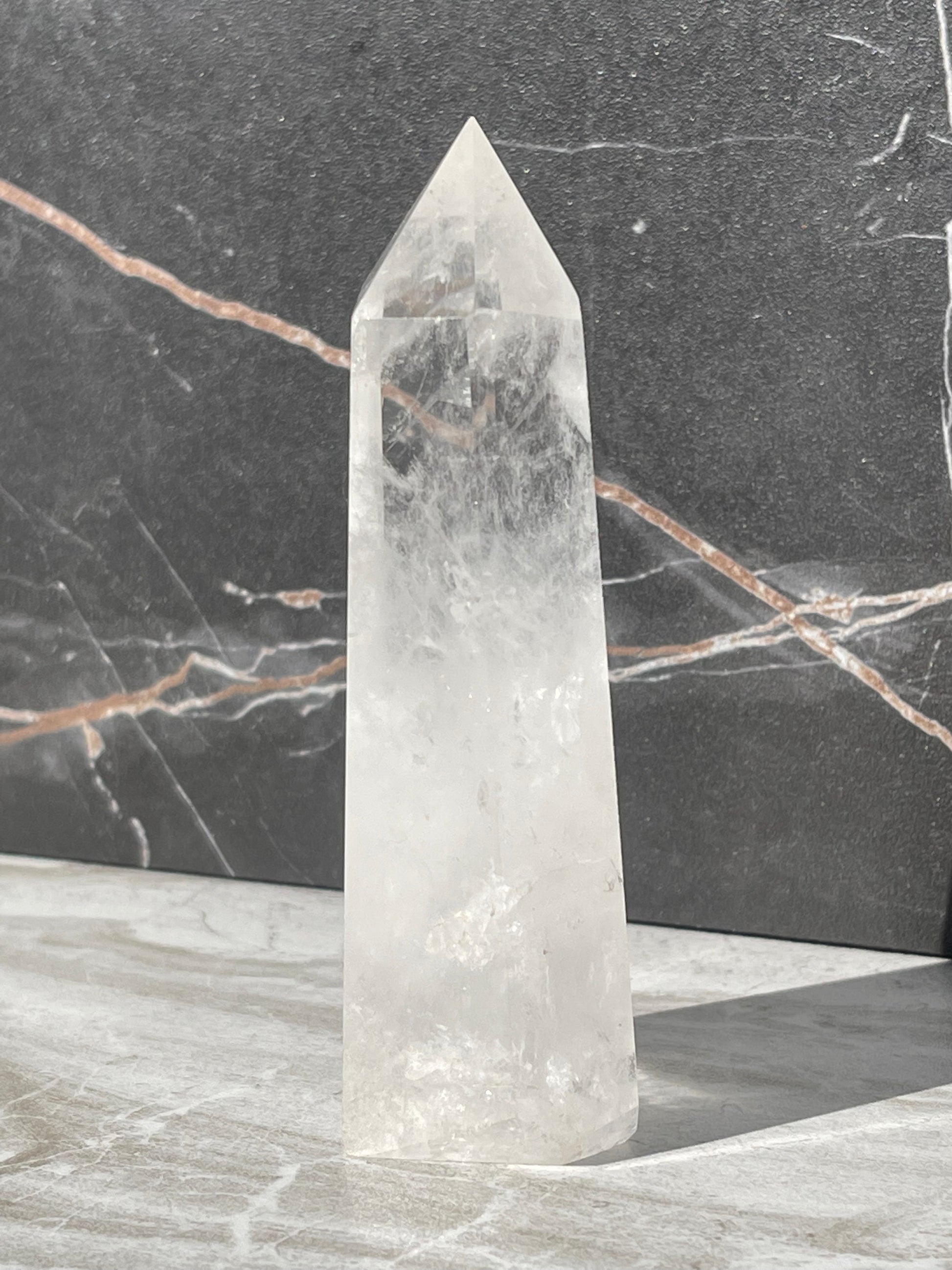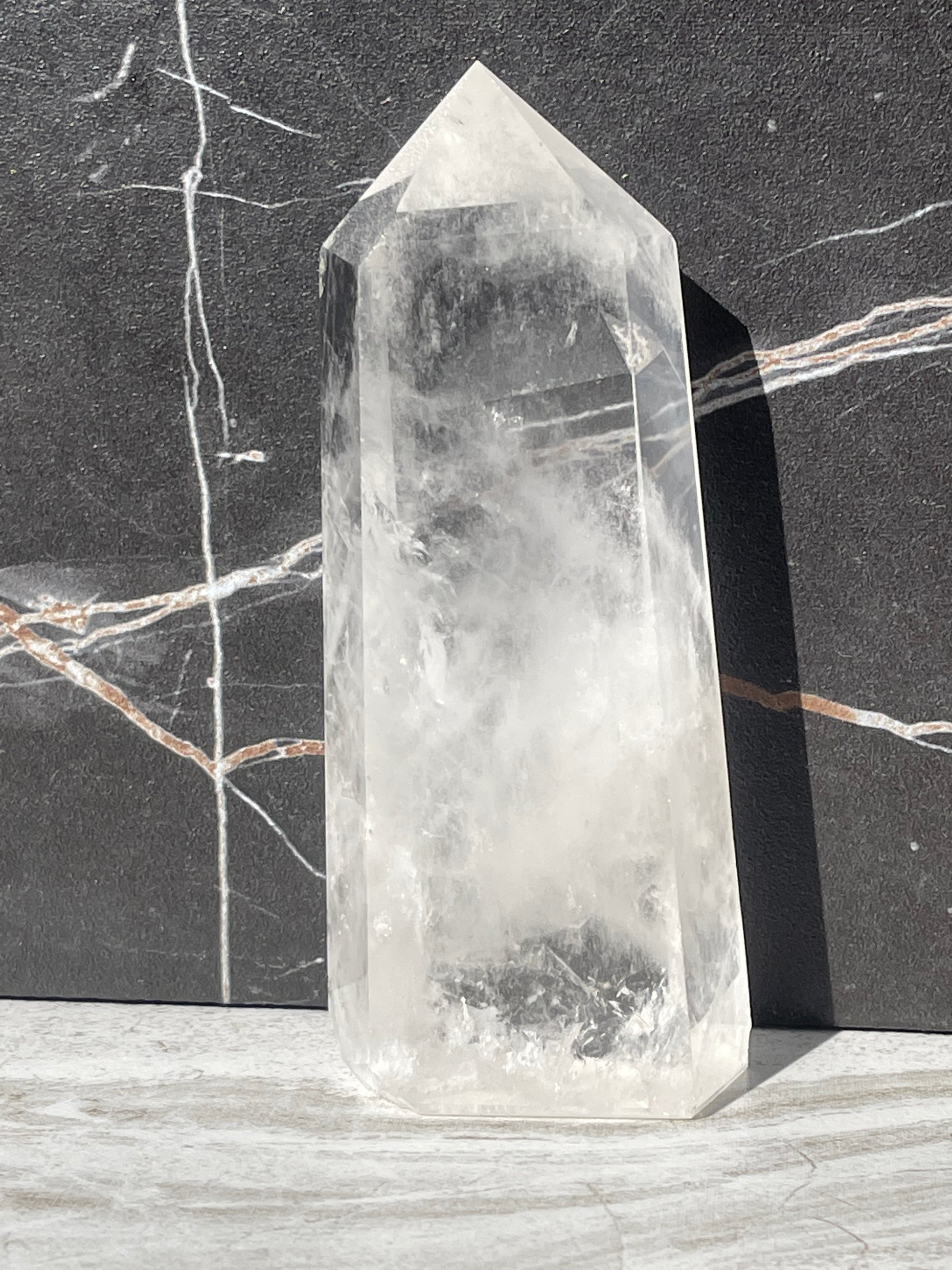 This beautiful, powerful and mesmerizing clear quartz tower enhances psychic ability.  It aids in concentration and unlocks memory.  Stimulates the immune system and brings the body into balance.  Also enhances energies from other crystals and can be used to cleanse other stones.