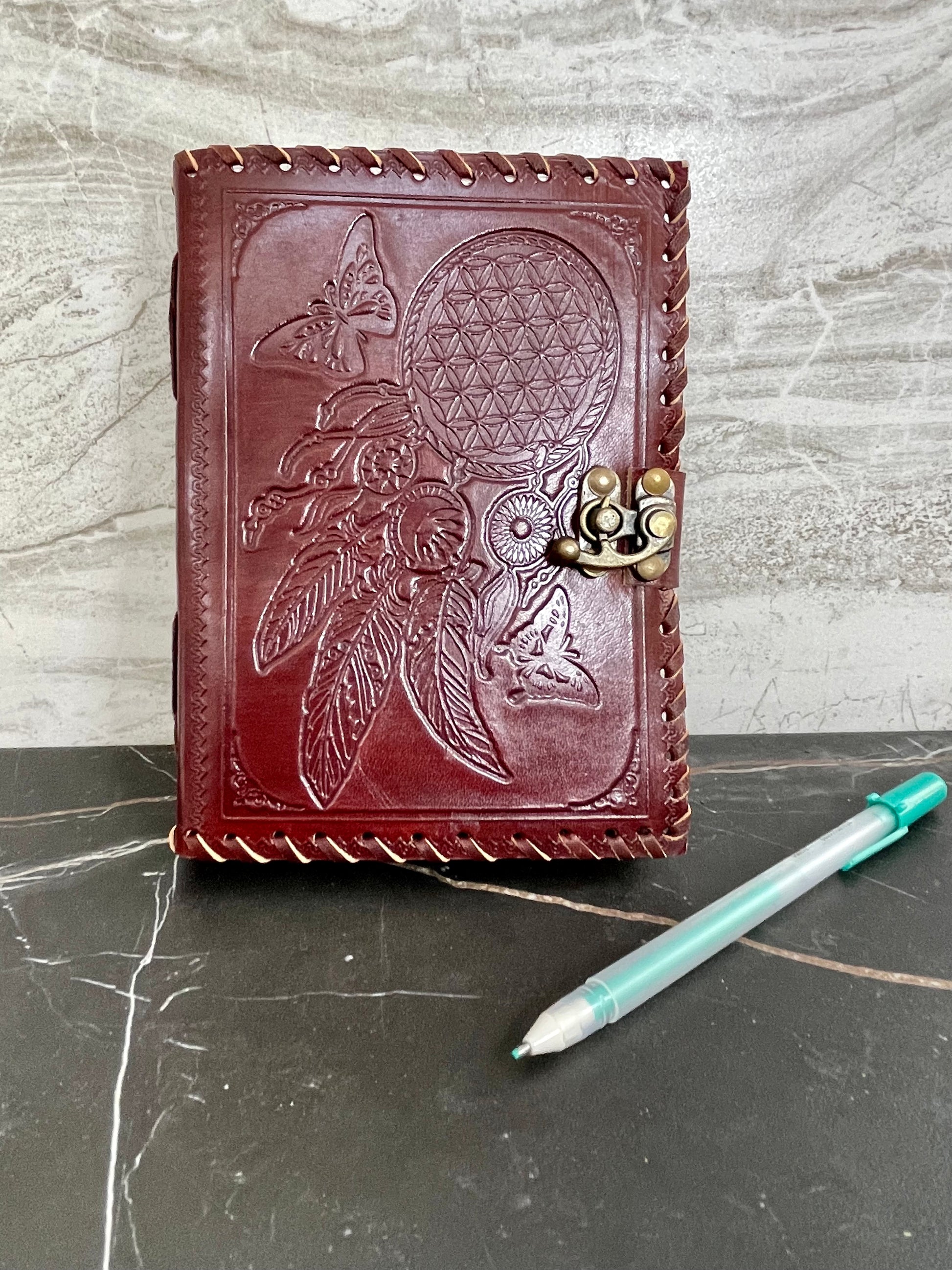 This Dreamcatcher Leather Journal is a stylish and functional choice for budding writers. Crafted from high-quality leather and featuring a vintage dreamcatcher design, this journal promises durability and timeless appeal. Its secure latch closure keeps your notes and ideas safe, perfect for jotting down thoughts, recording memorable moments, or tracking progress.