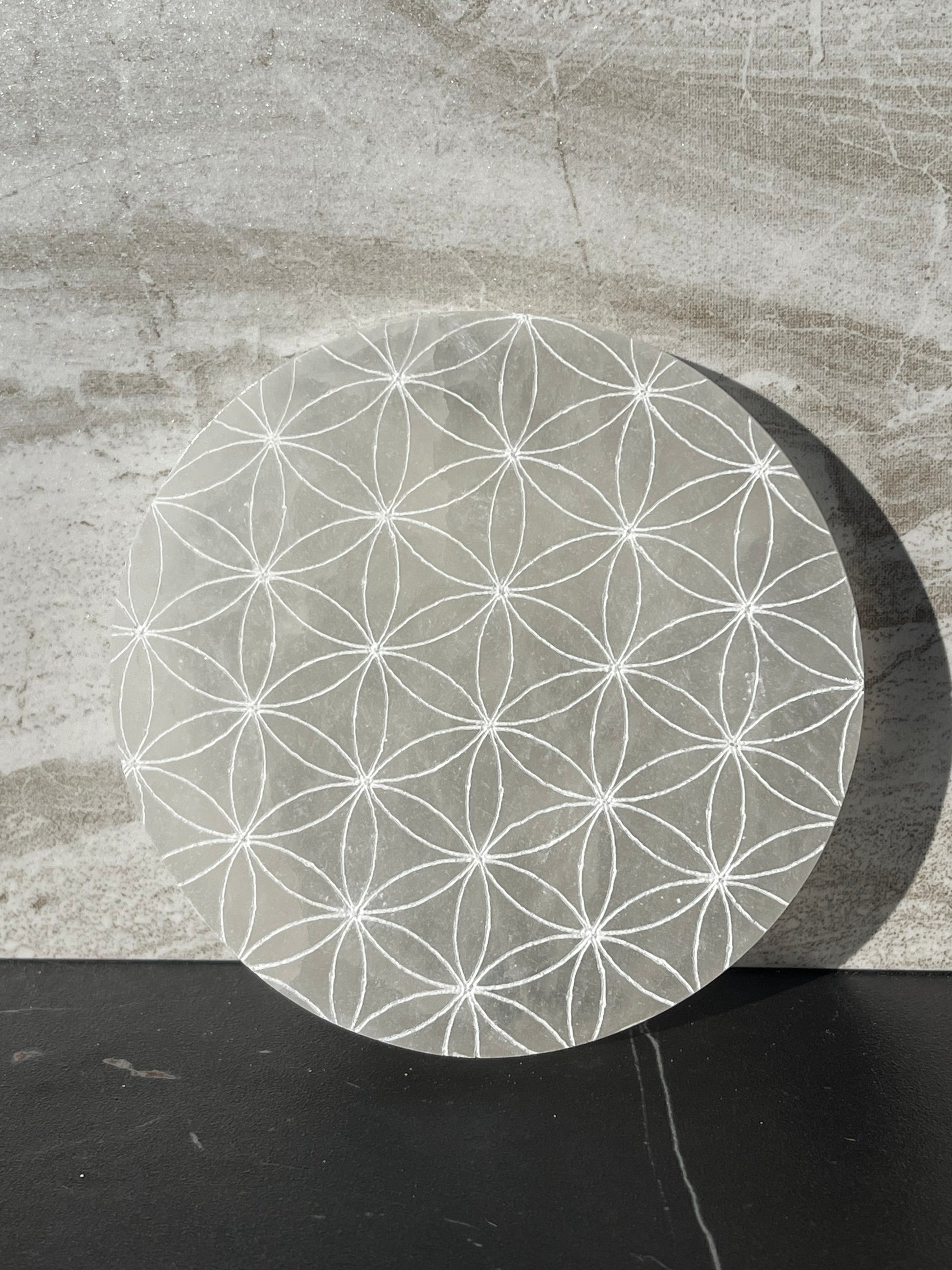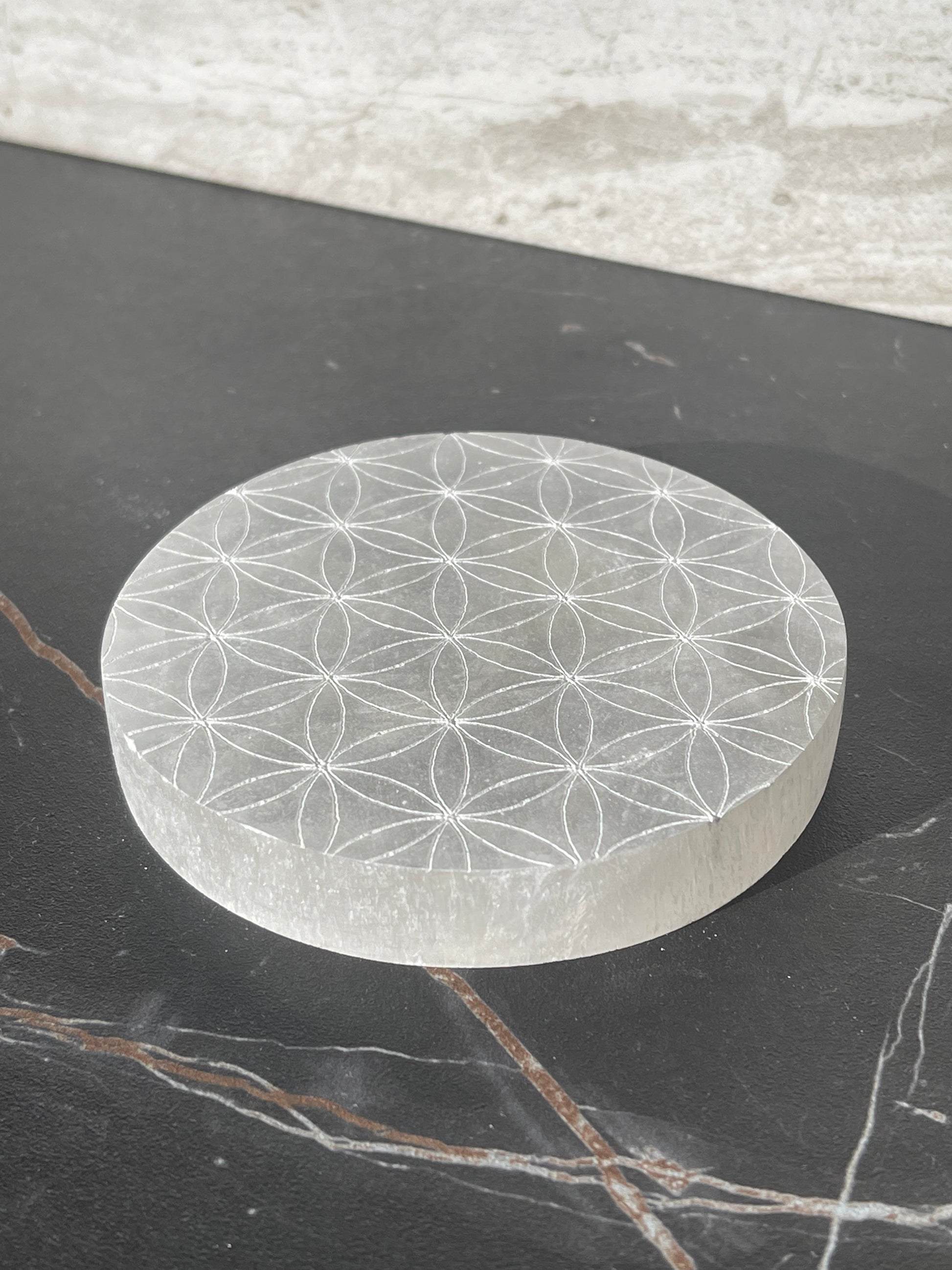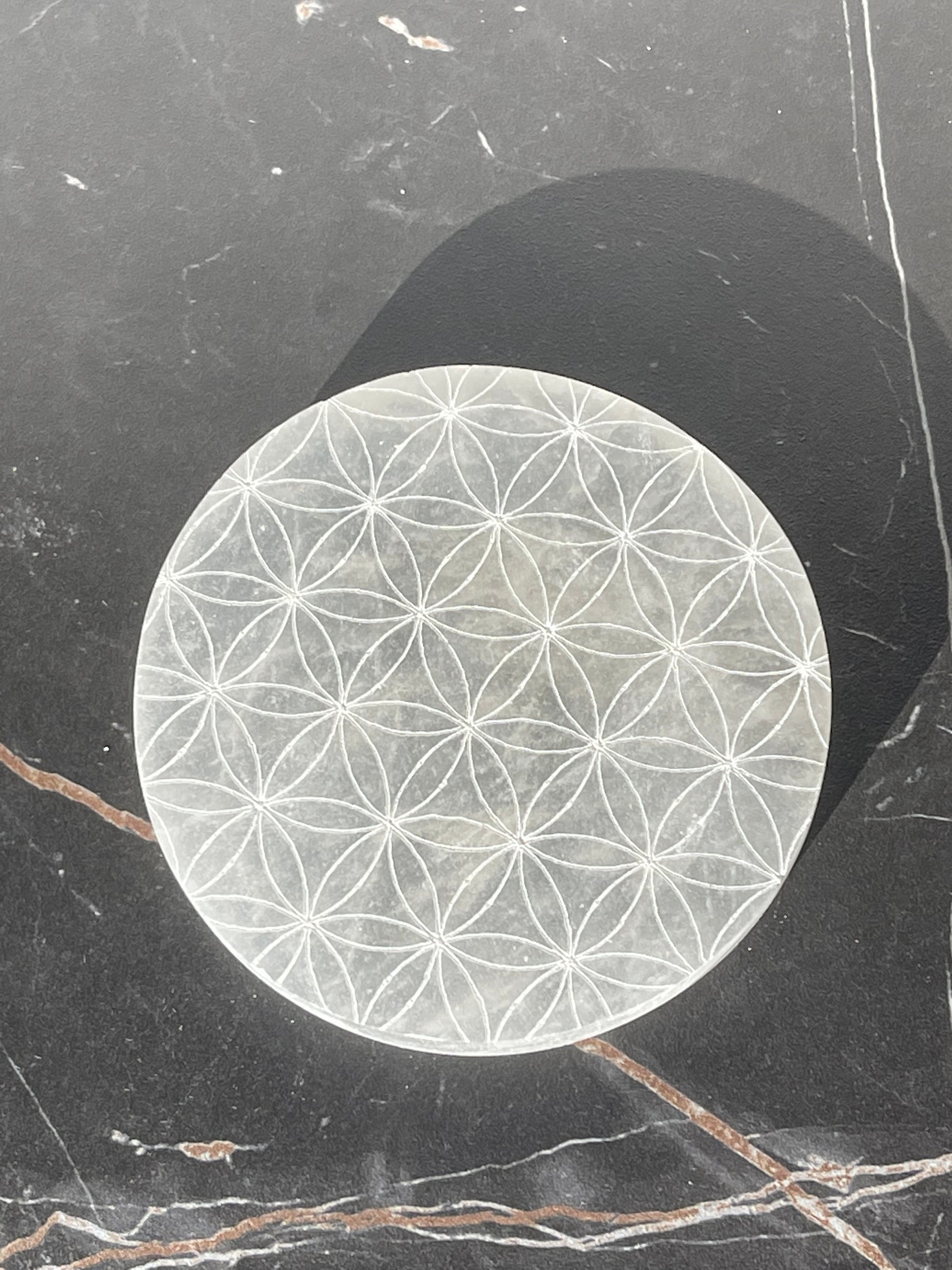 Flower of life Selenite charging plate.  The Selenite charging plate naturally cleanses, charges, reactive and amplifies crystals and gemstone jewelry placed upon it.  The powerful vibration of Selenite activates all Chakras, especially the Crown Chakra.
