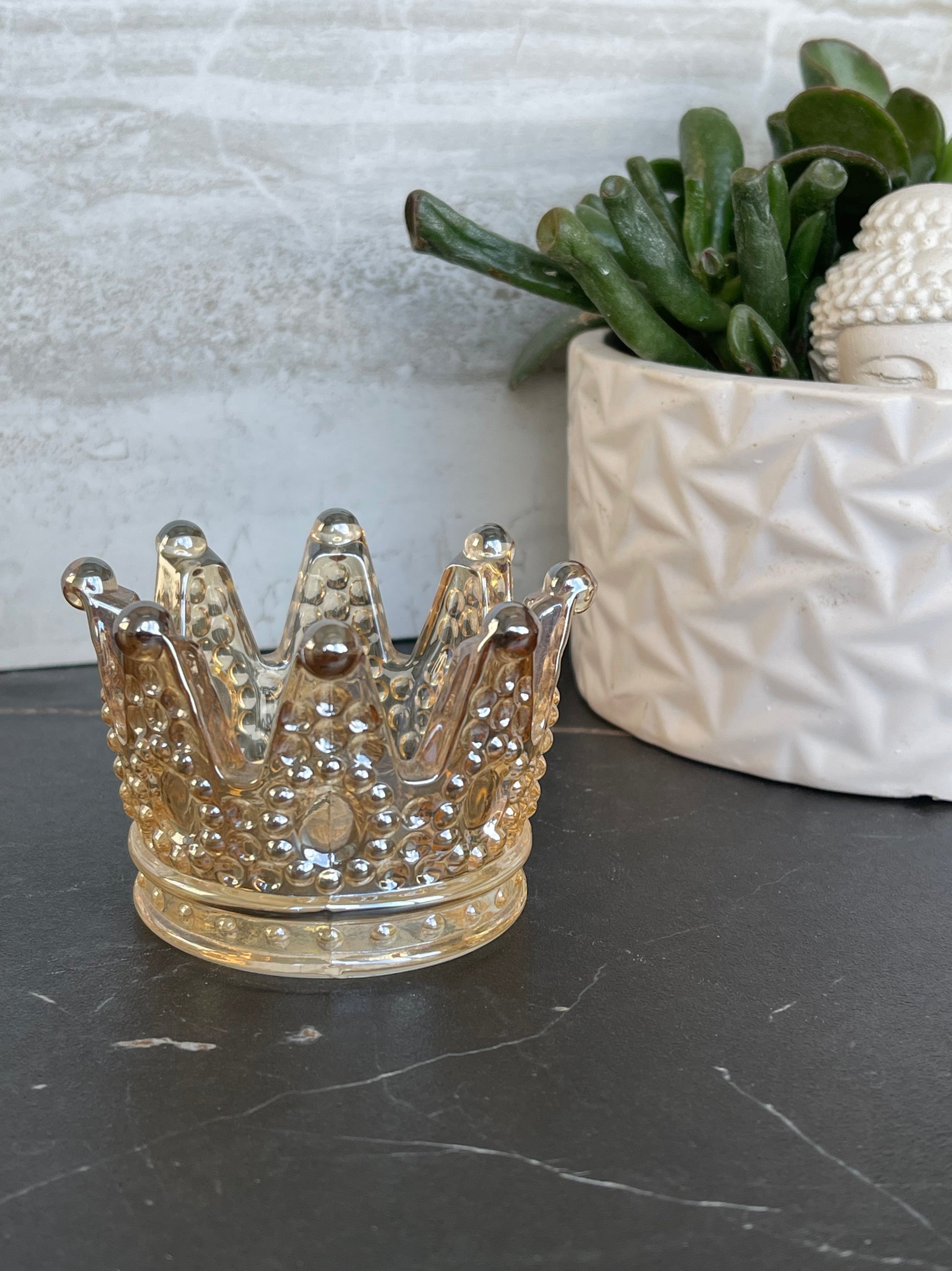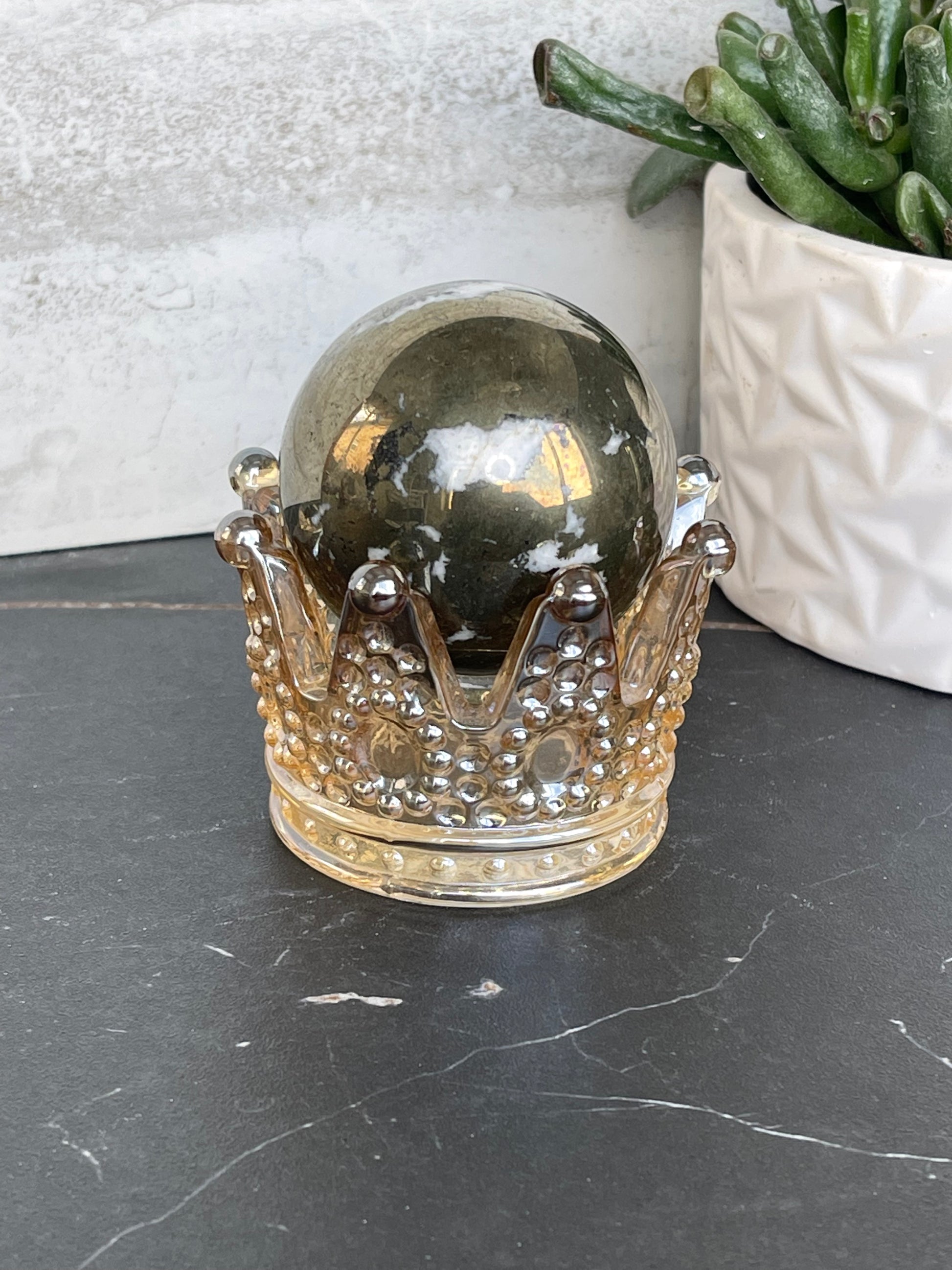 This sphere holder is made of glass and is an iridescent yellow.  It’s about 3 inches in diameter and holds medium to XL spheres.