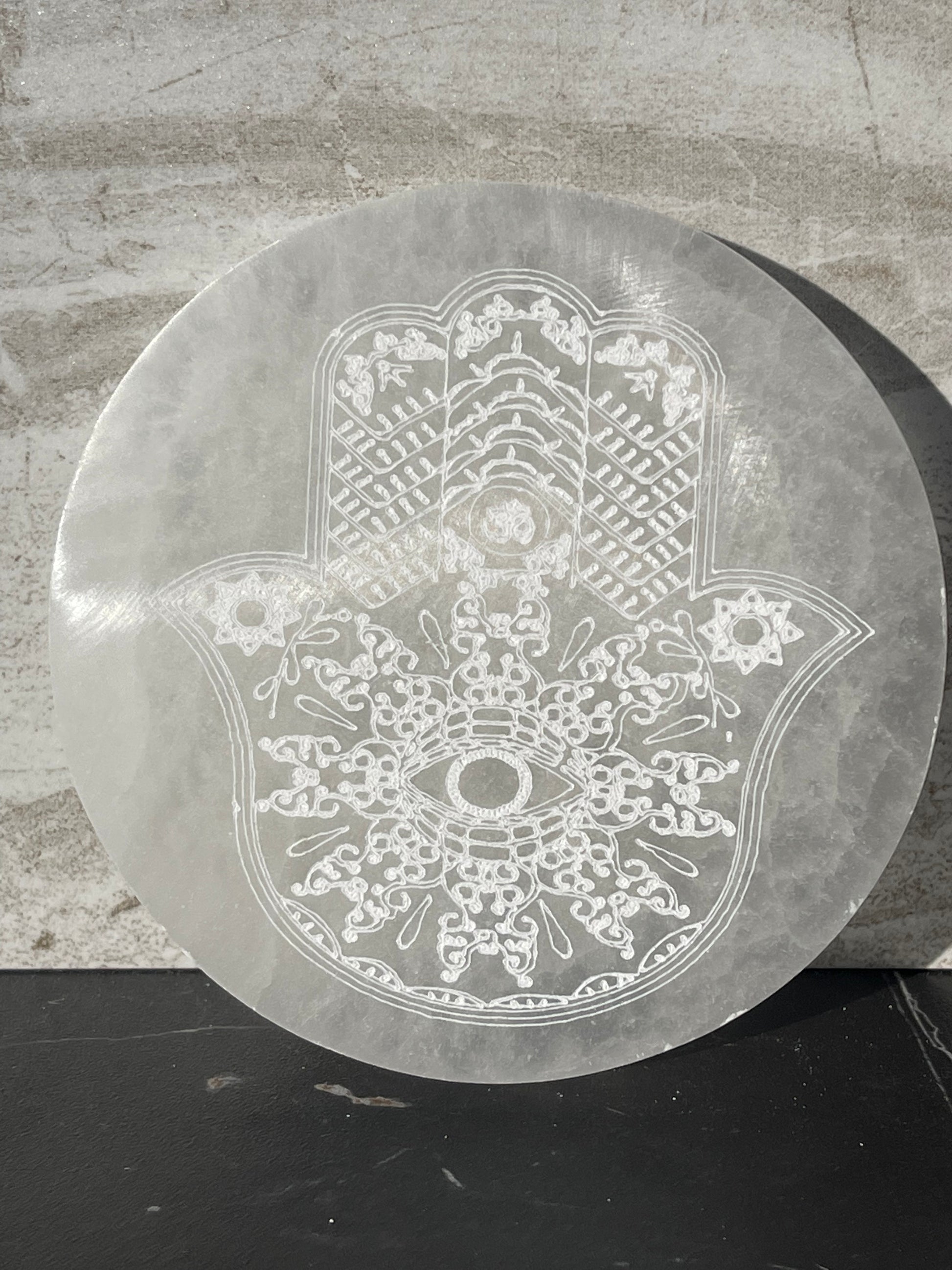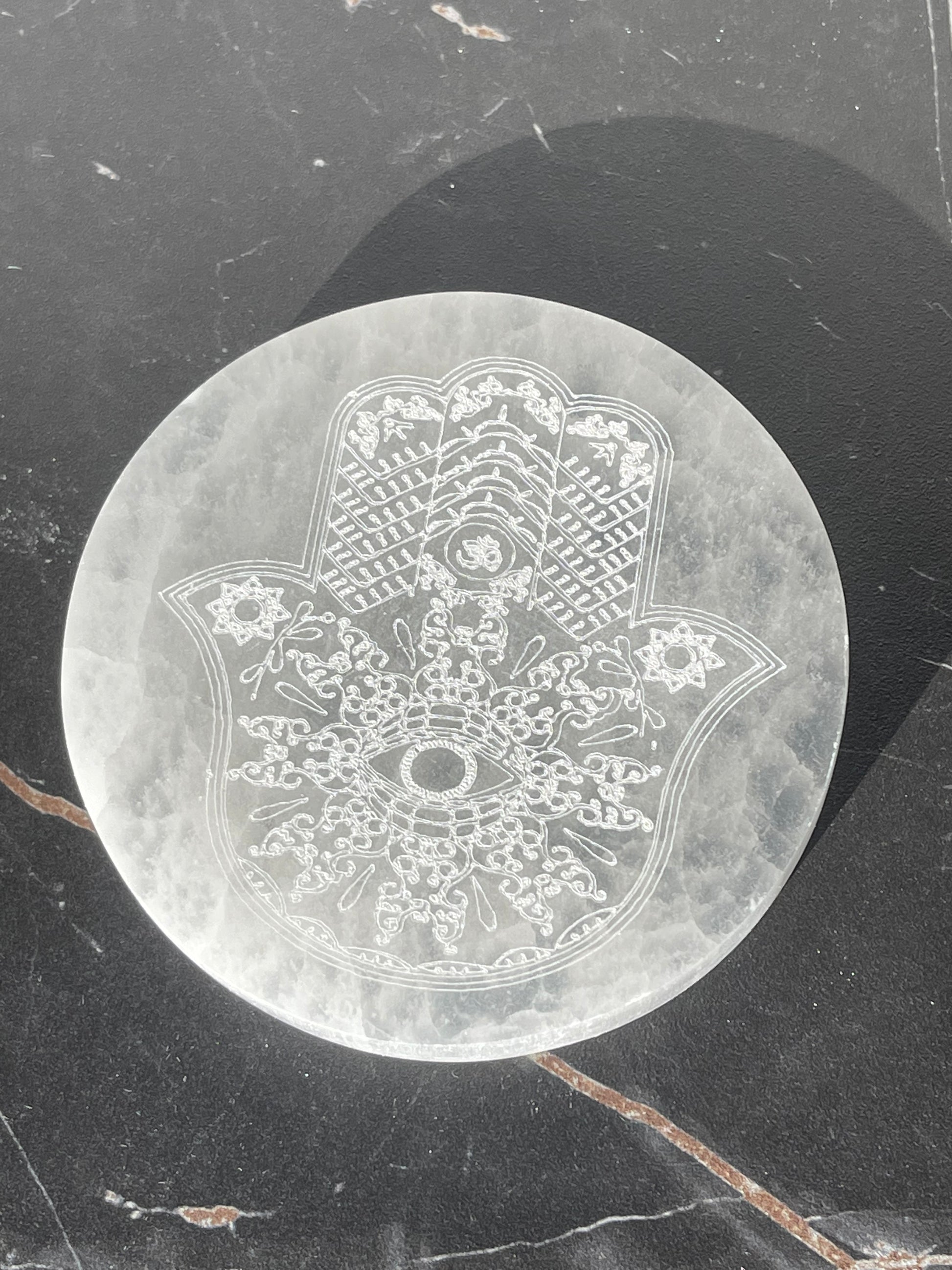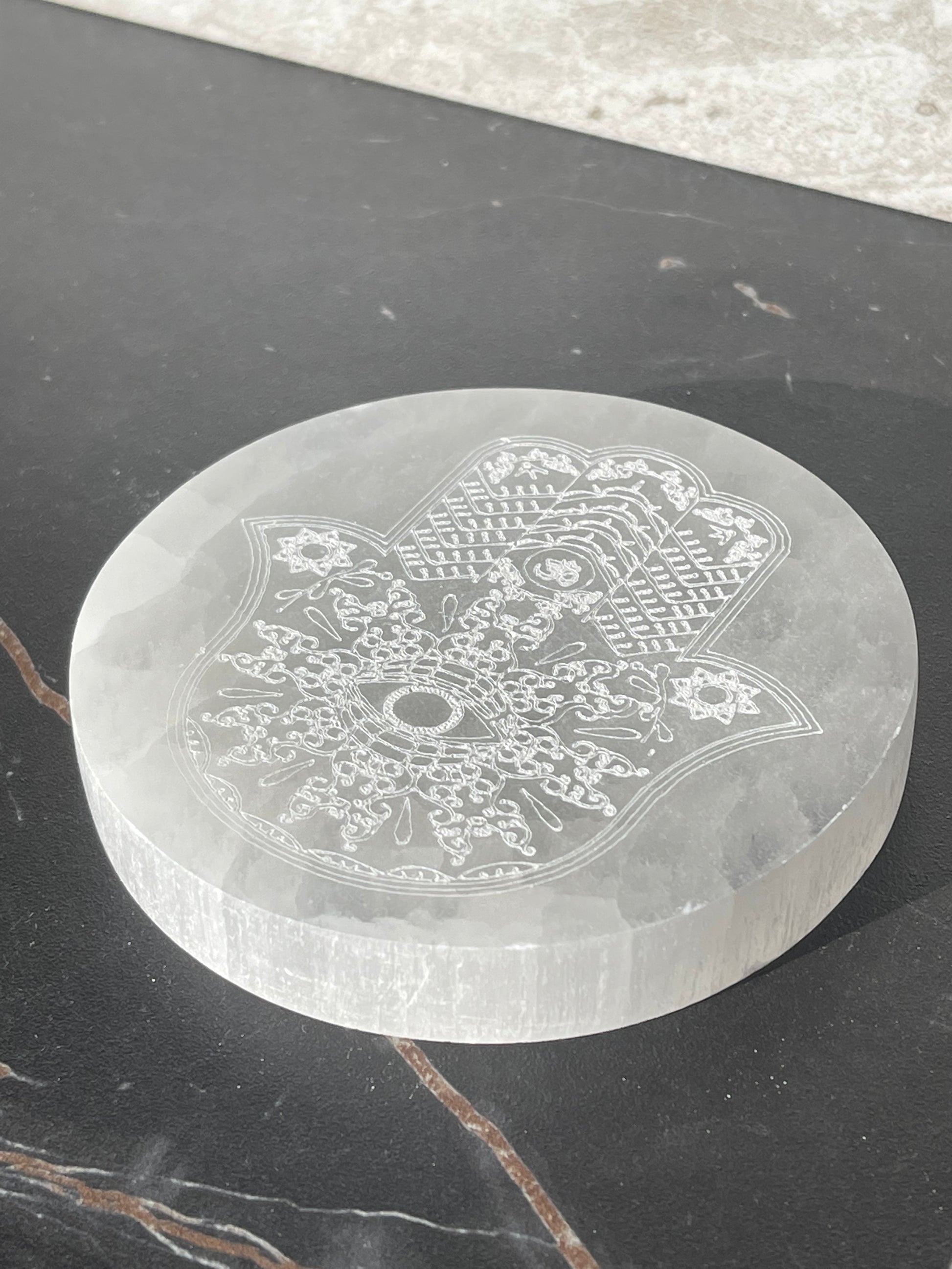 Hamsa Selenite charging plate.  The Selenite charging plate naturally cleanses, charges, reactive and amplifies crystals and gemstone jewelry placed upon it.  The powerful vibration of Selenite activates all Chakras, especially the Crown Chakra.