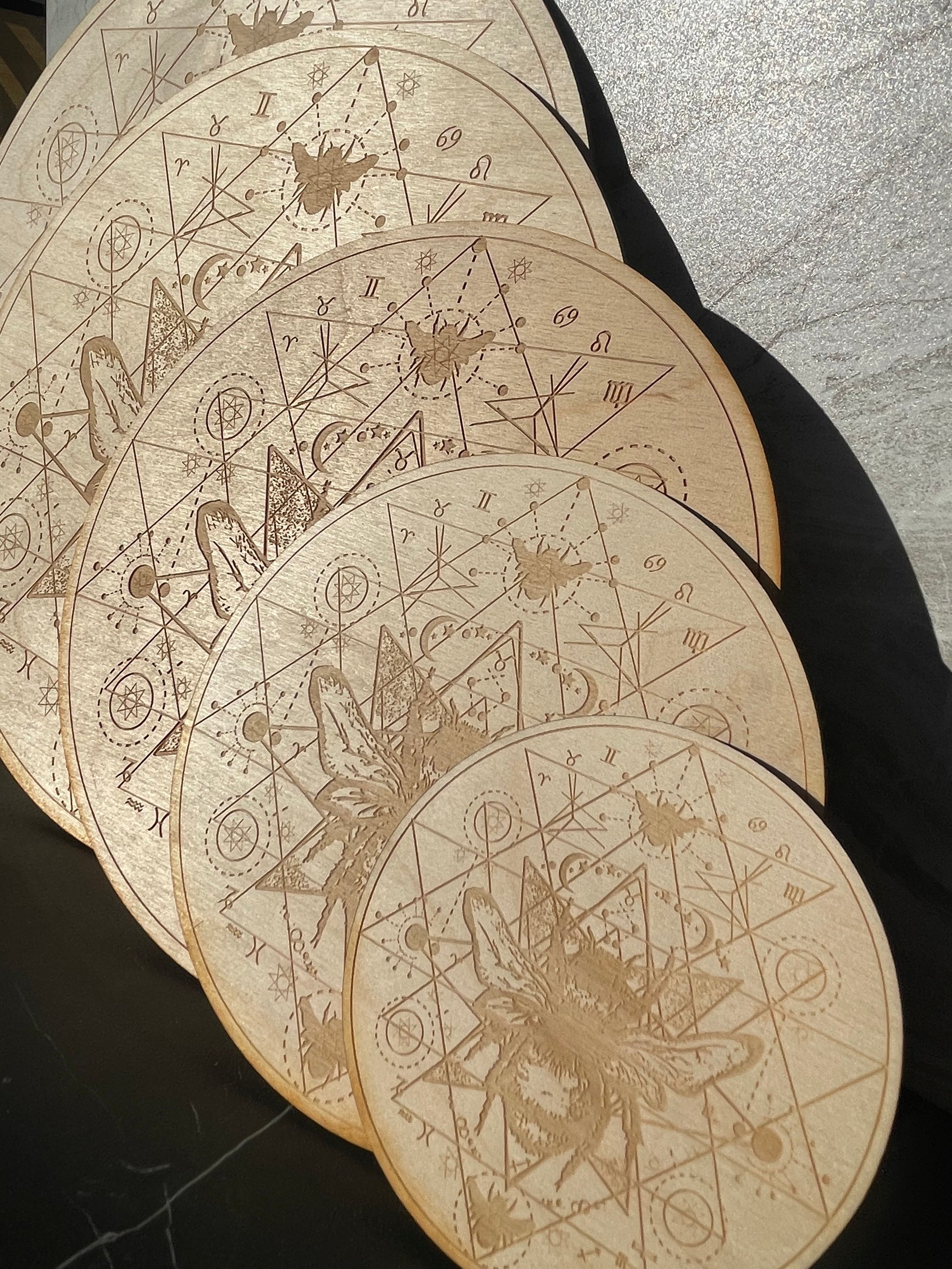 Honey Bee wooden crystal grids.  Multiple sizes for whatever your needs are.  Crystal grid is when you take different stones and set them up on a grid to help focus their energies for a specific intention.
