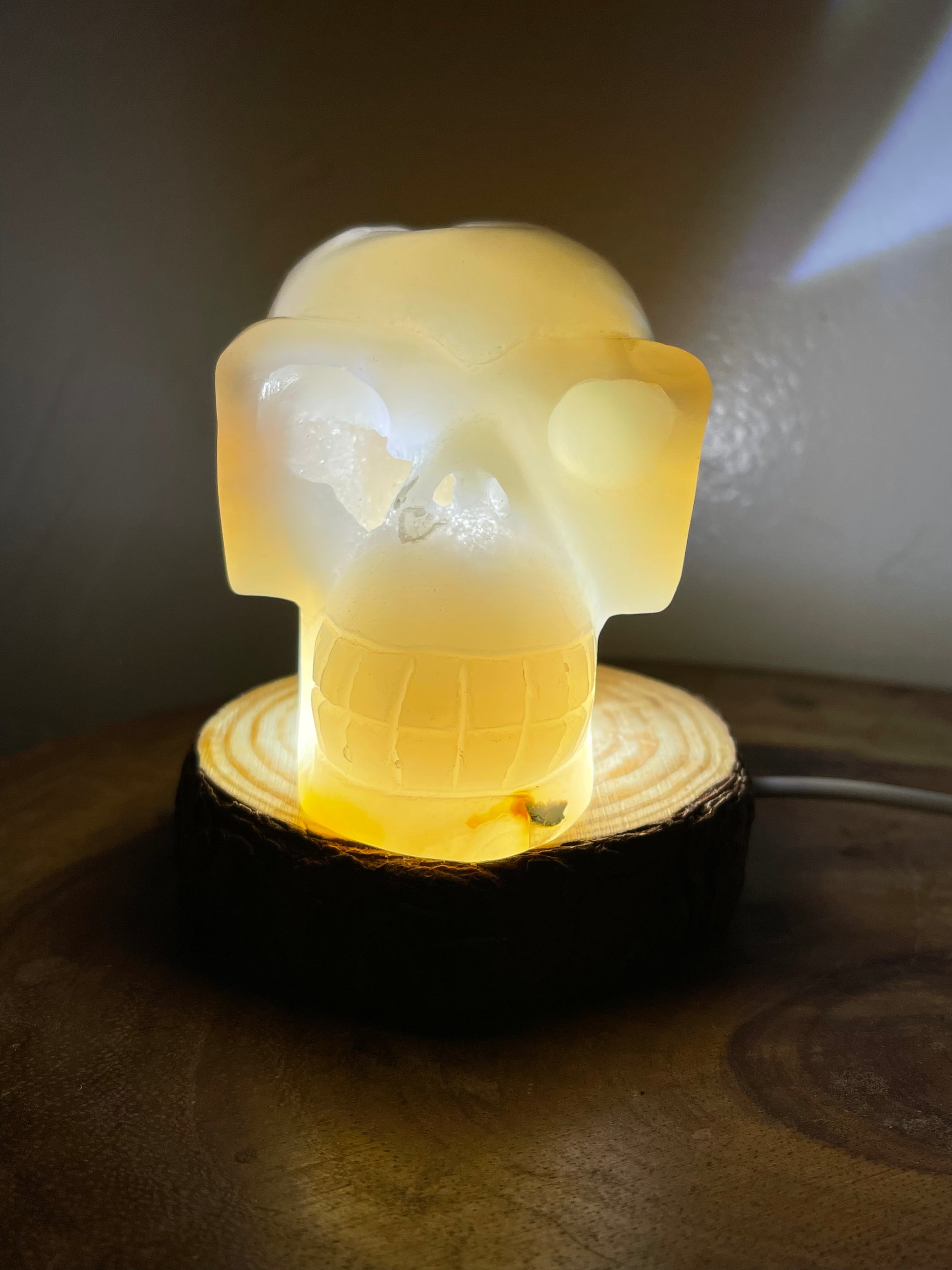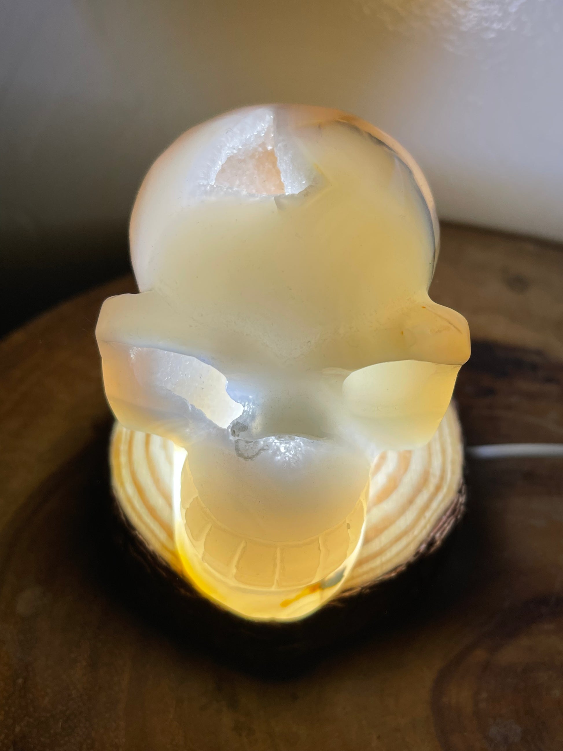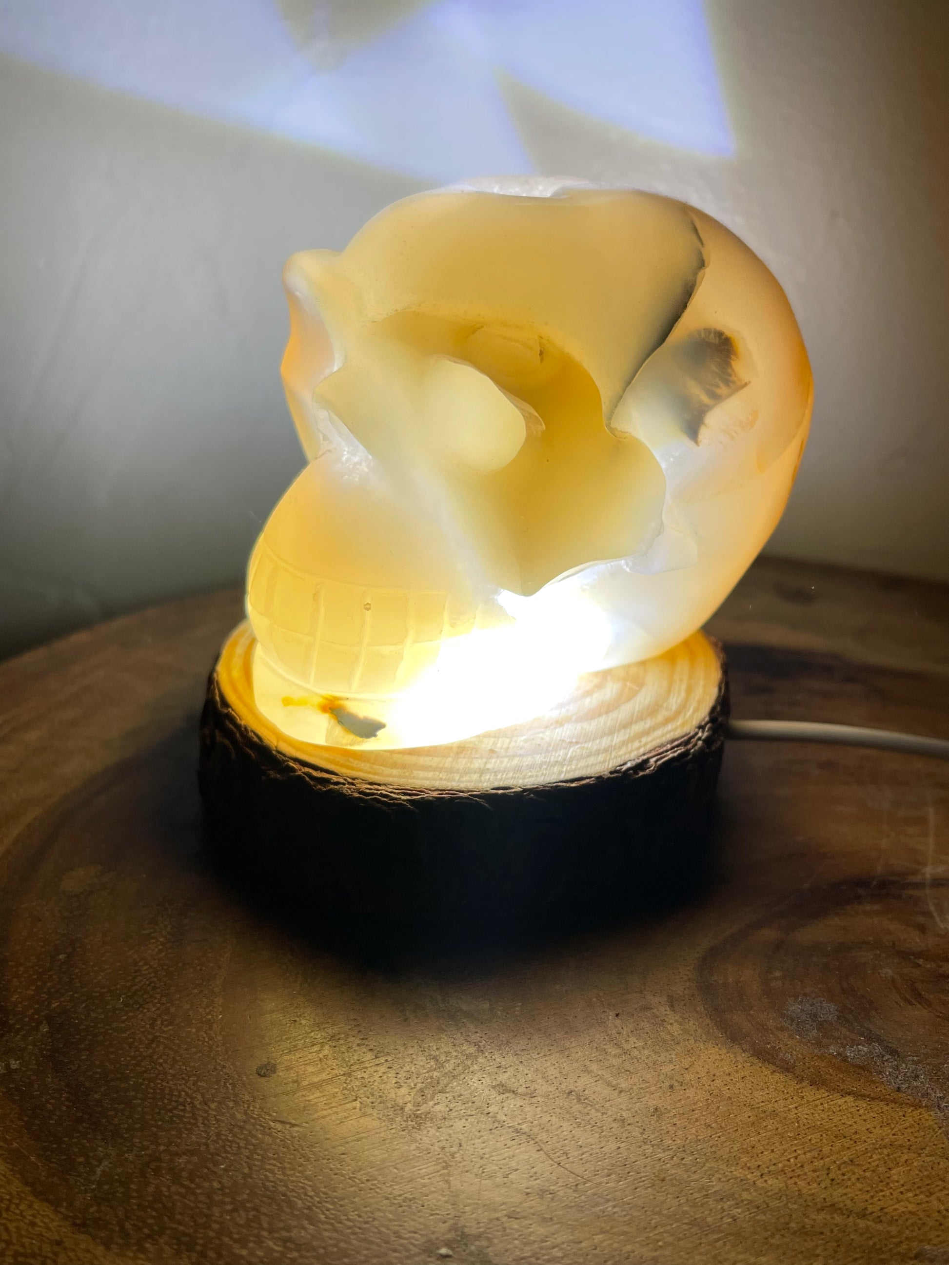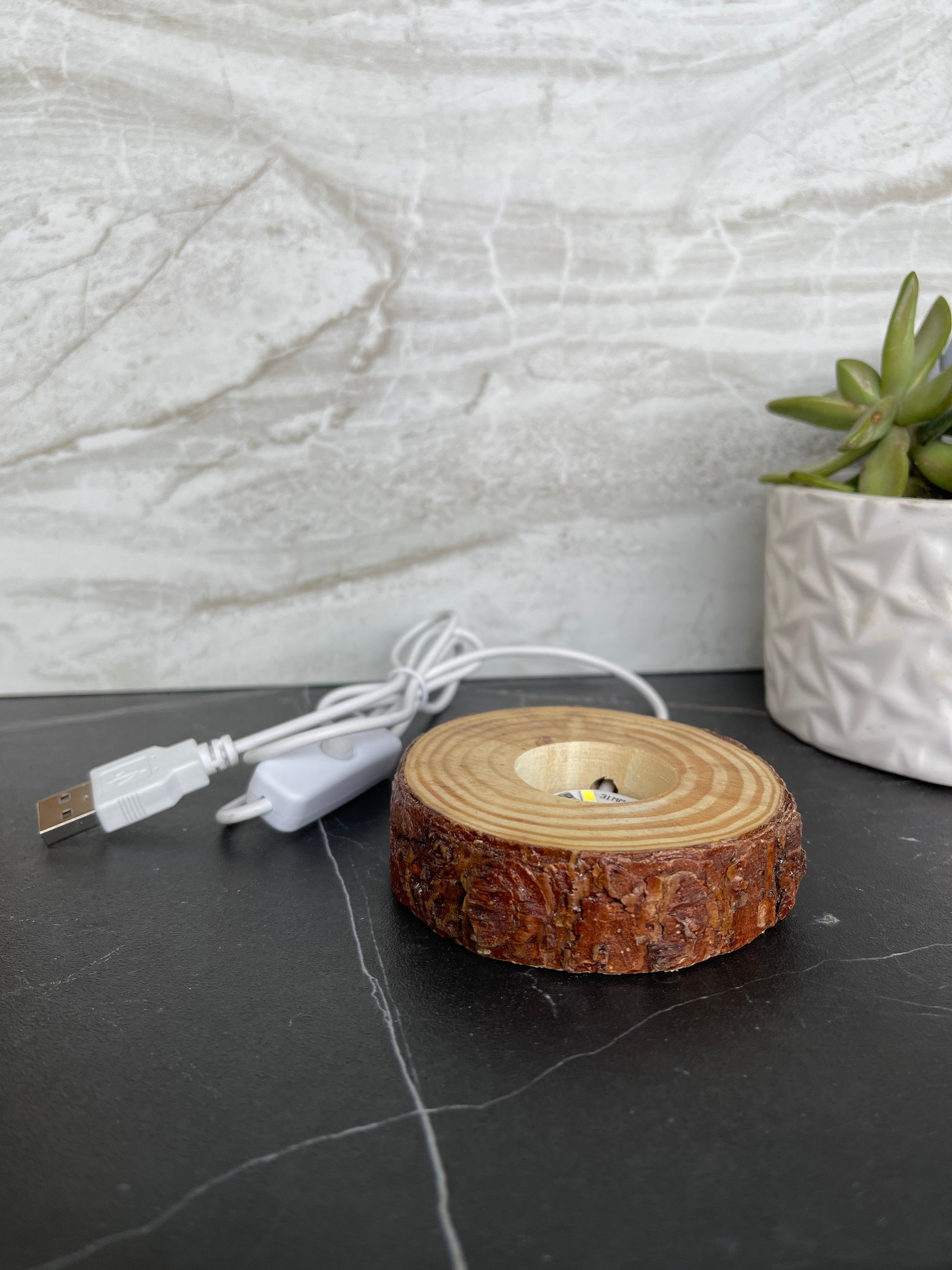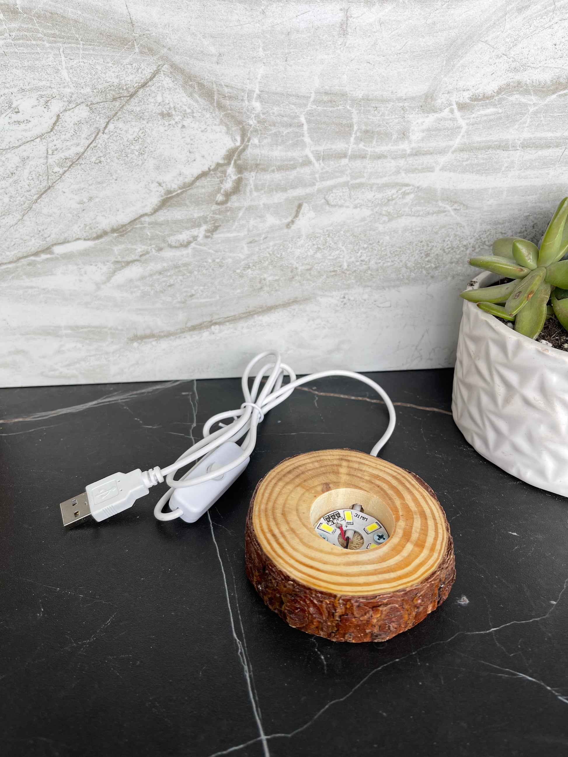 This is a wooden LED light.  Place any crystal that is iridescent or has druzys, and the light will shine through, its the perfect nightlight, lamp, display for your favorite crystals.