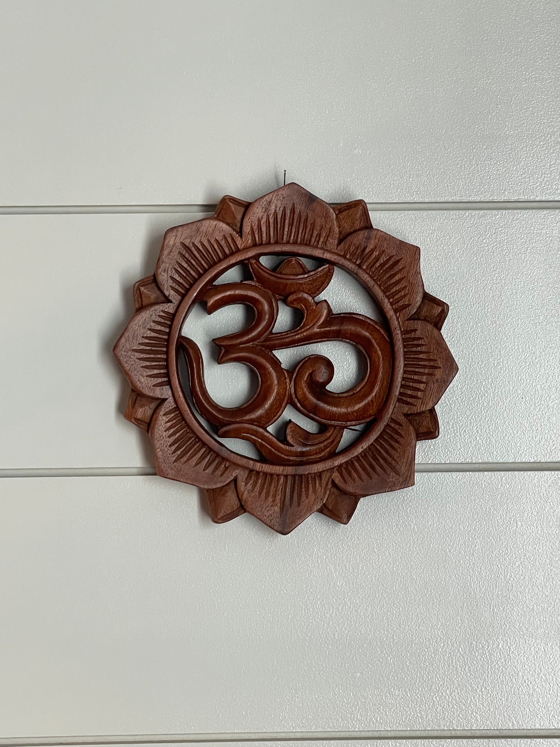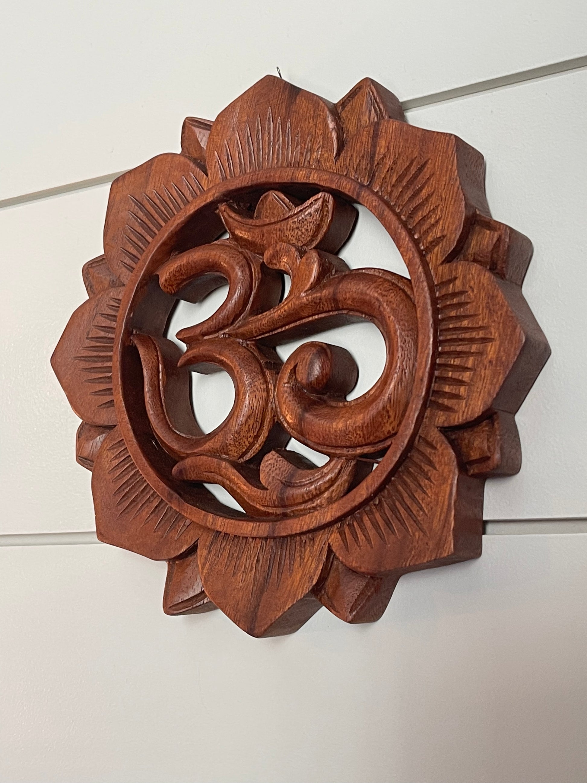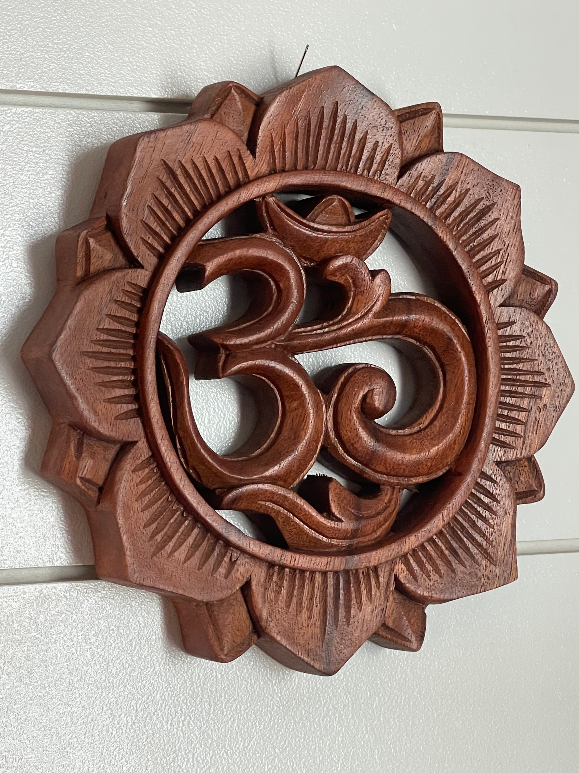 Beautiful Carved wood lotus ohm wall hang.  Ohm is considered the syllable which preceded the universe and from which the gods were created, or the sound of the universe its self.  The lotus, because it rises from the mud without stains, they are often viewed as a symbol of purity.  Since they return to the murky water each evening and open their blooms at the break of day, lotus flowers are also symbols of strength, resilience and rebirth.