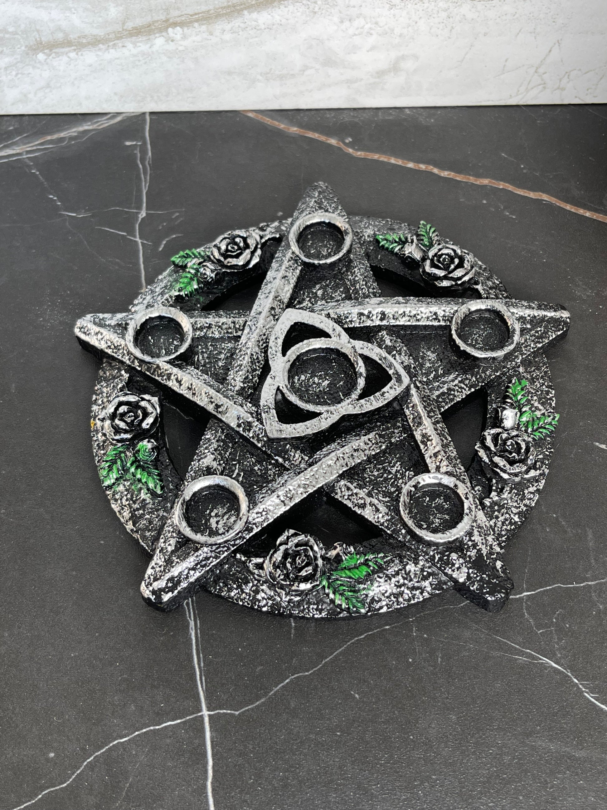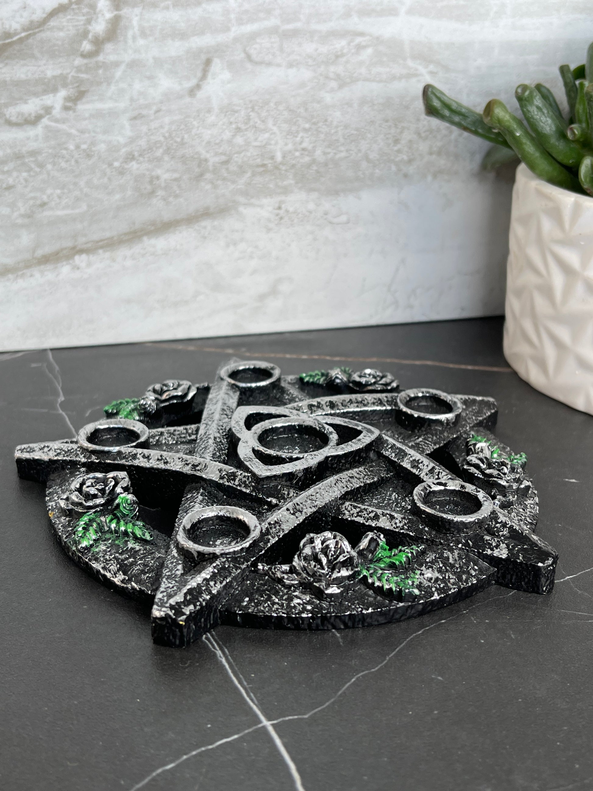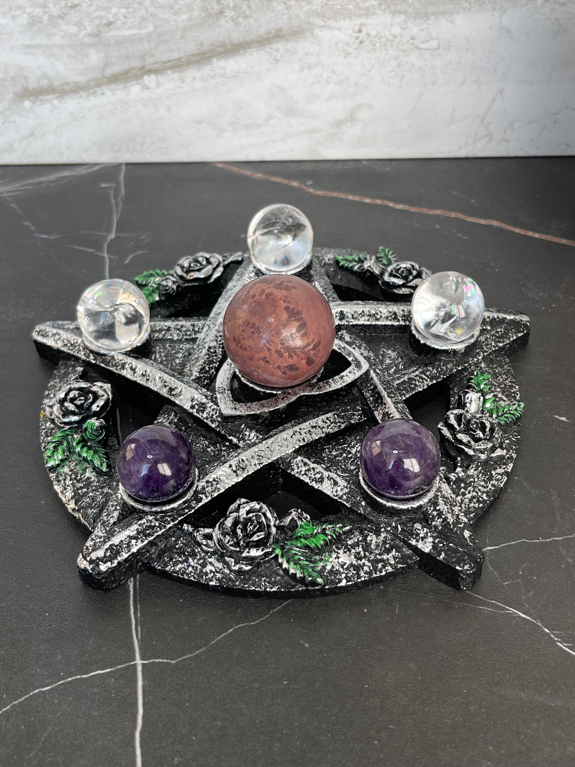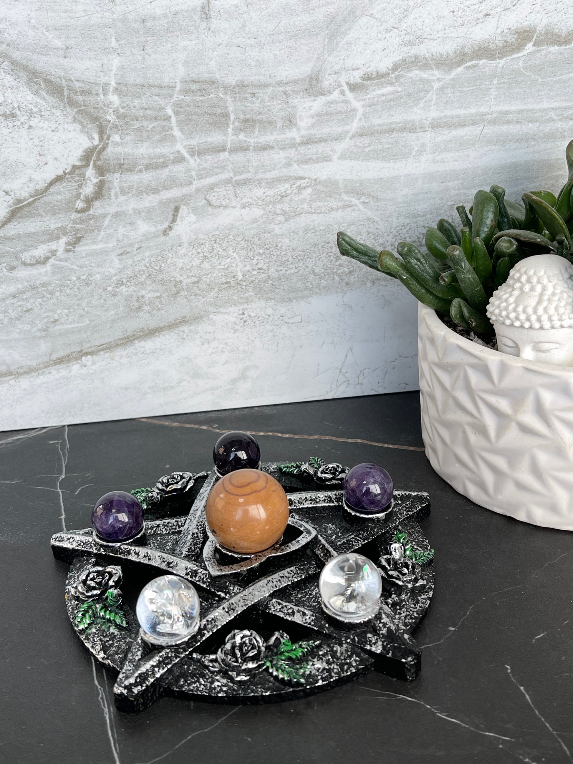 This sphere holder is a pentagram.  It’s perfect for a small crystal grid display.  This display can hold tumbled crystals, raw crystals, as well as small spheres.