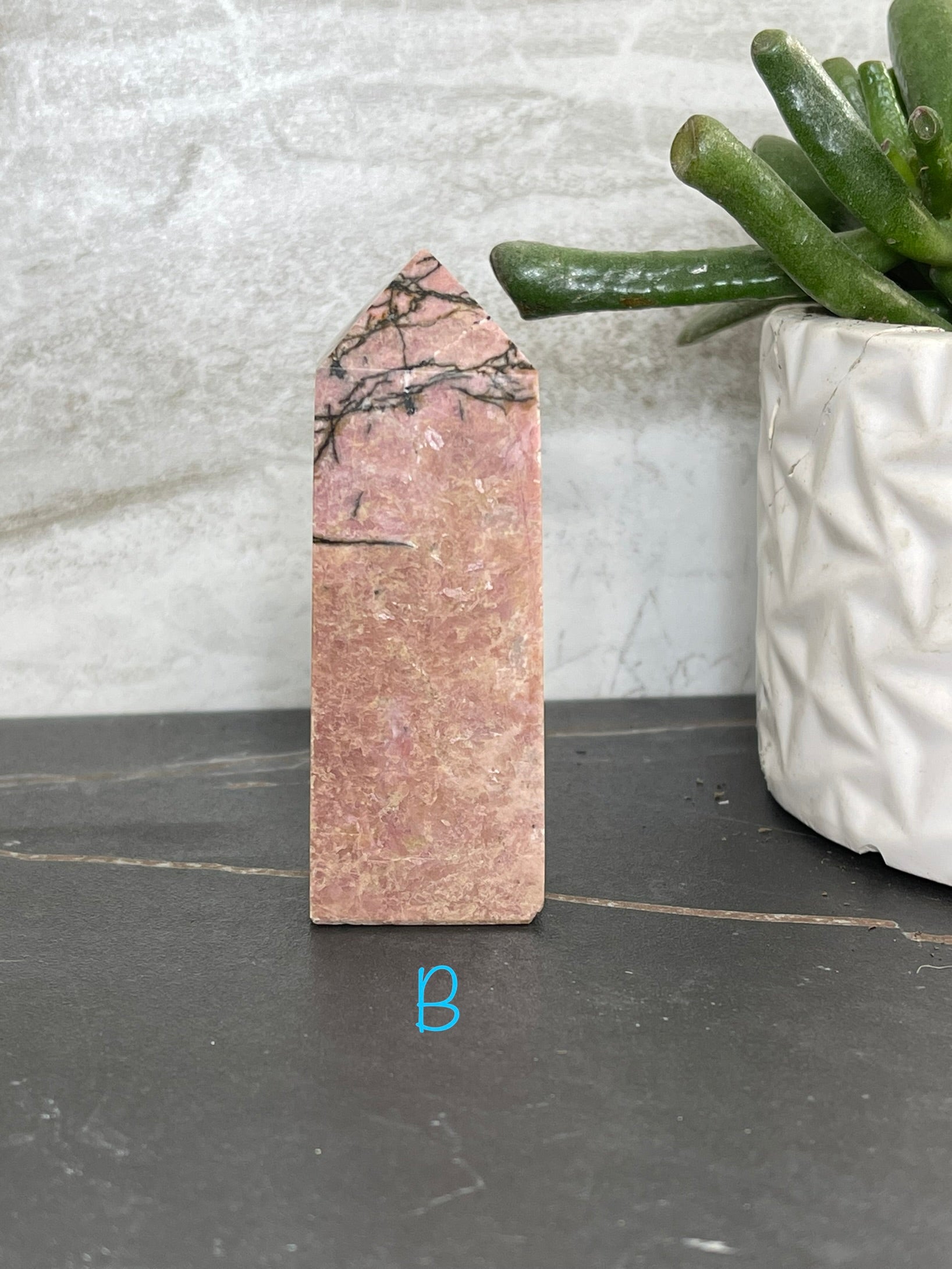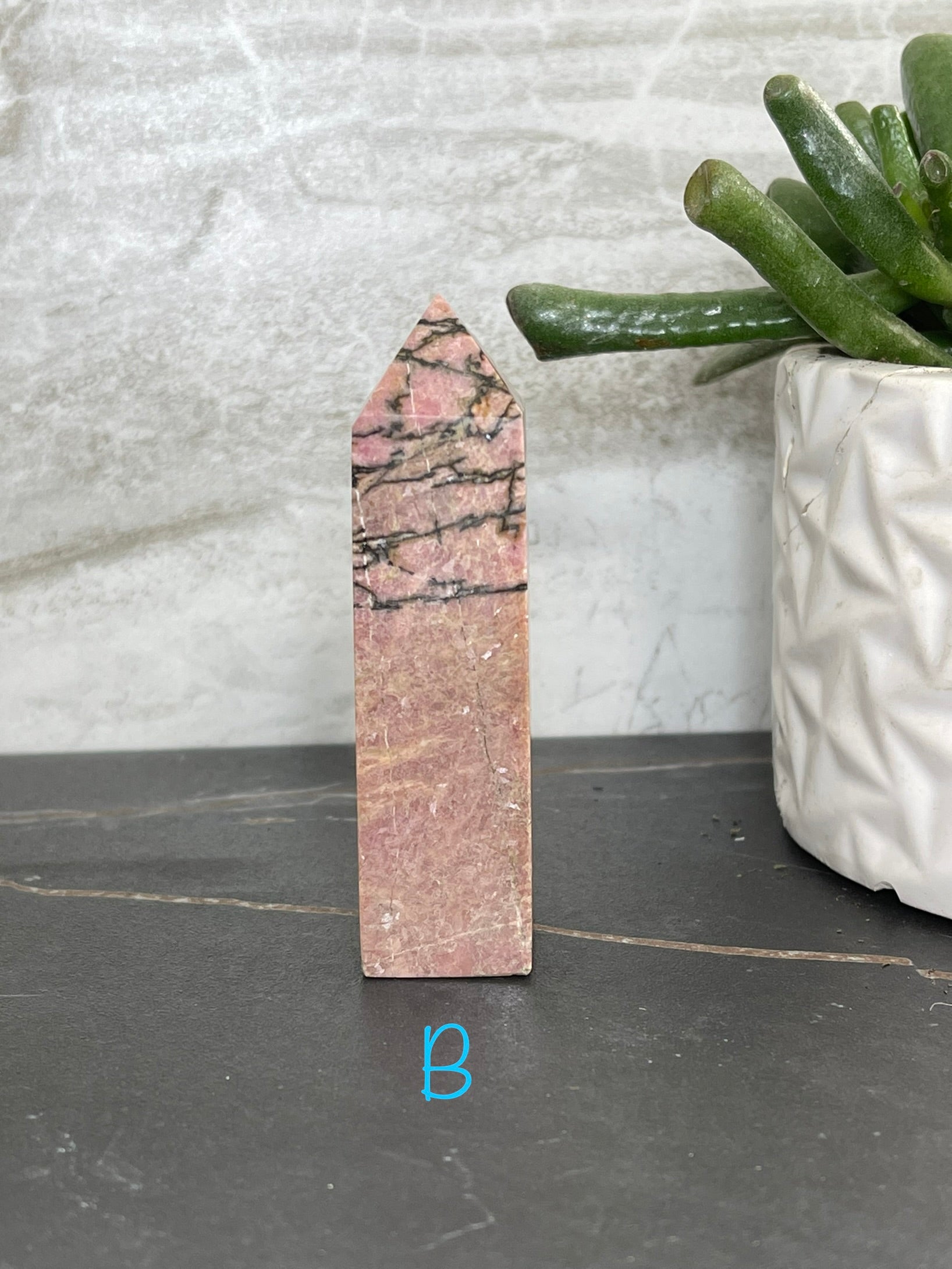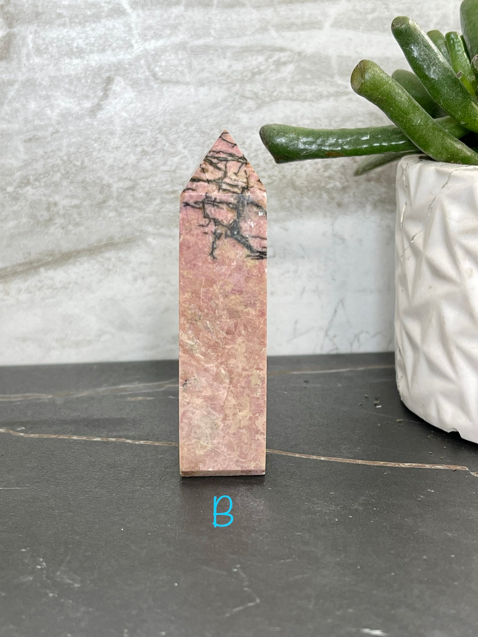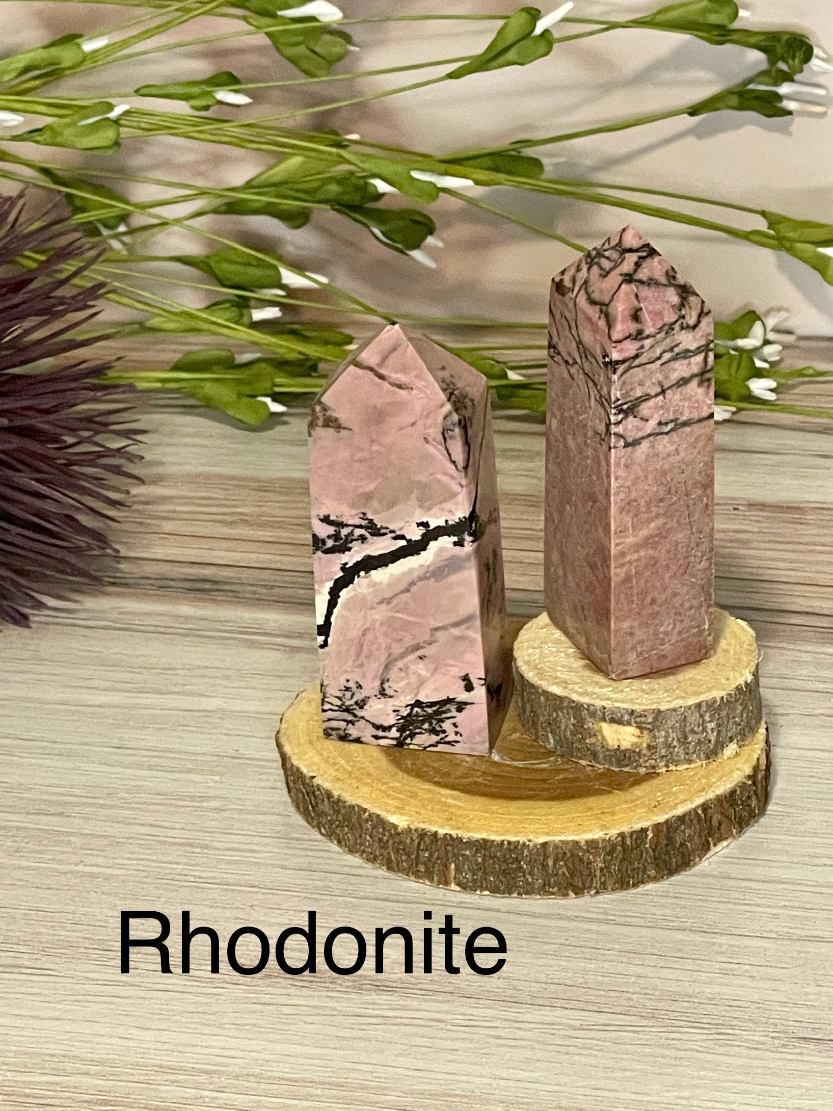 Rhodonite Points are the perfect accompaniment to any practice of self-care. This unique stone of compassion balances emotions and clears away past trauma, allowing for true healing and the potential for love. With its ability to ground energy, balance yin-yang, and activate the heart chakra, Rhodonite facilitates achieving one's highest potential. It is a fantastic tool for relieving emotional shock and panic. The Rhodonite Points measure approximately 3 ¼ in. tall and 1 ¼ in. wide.