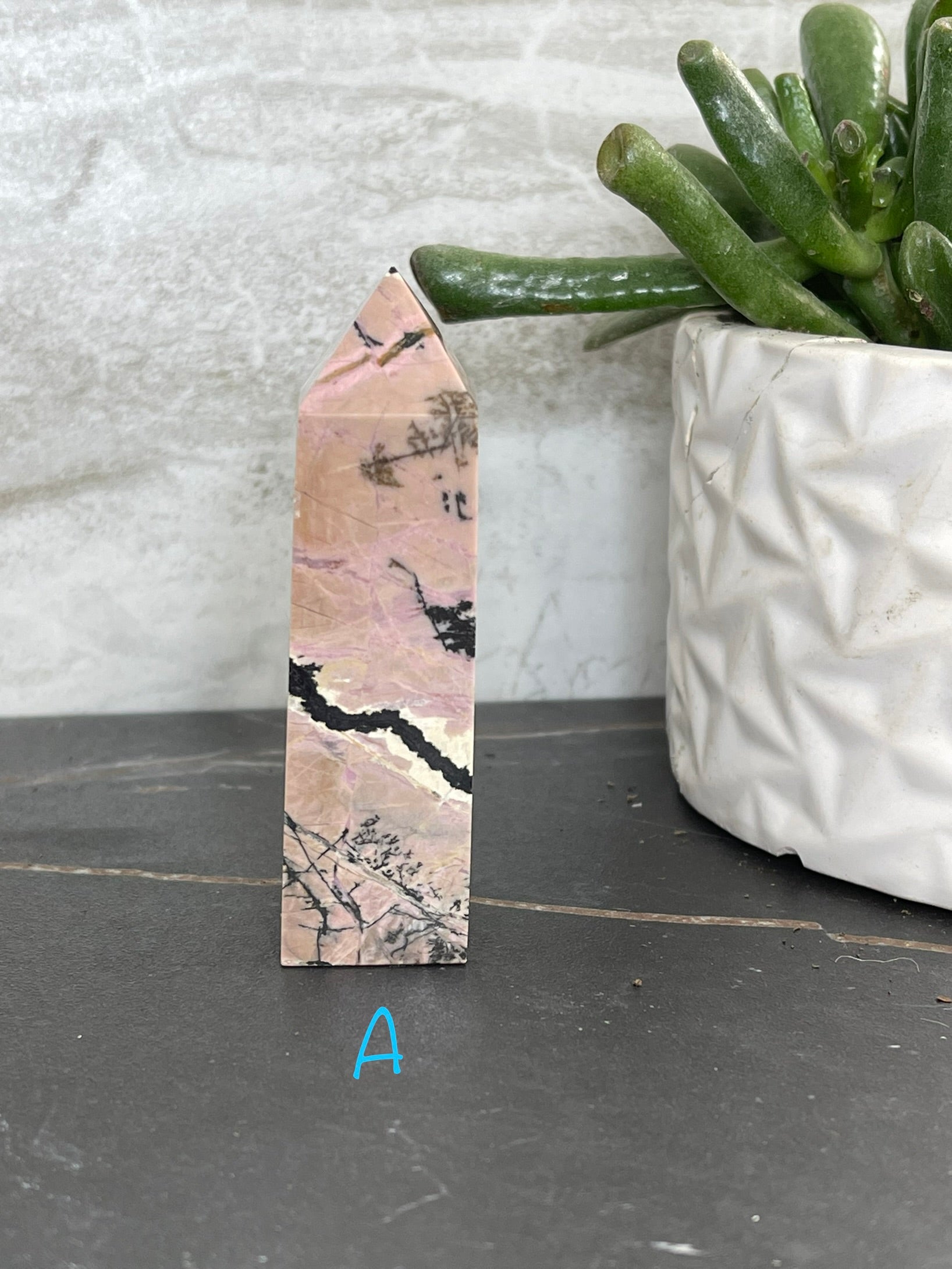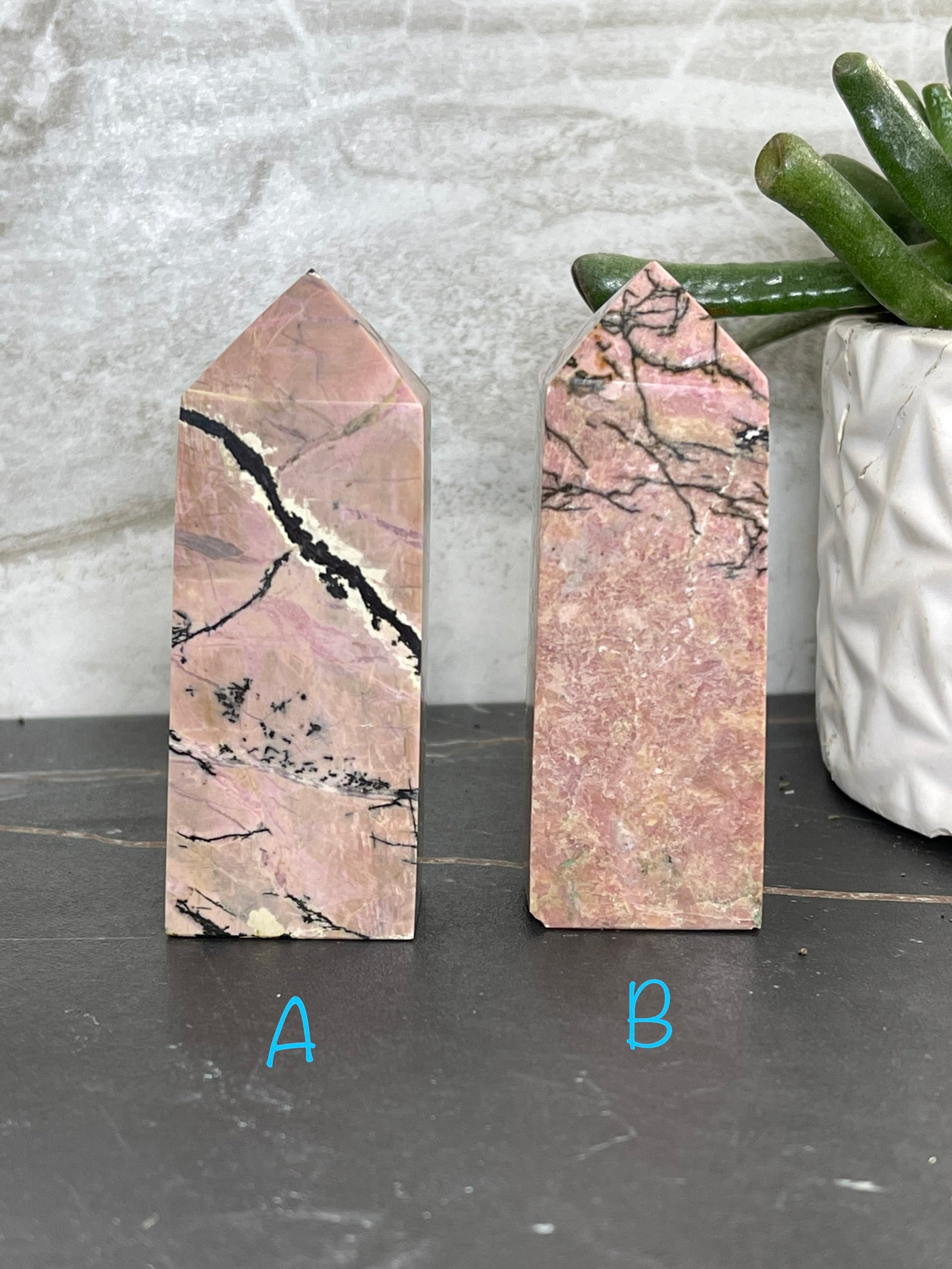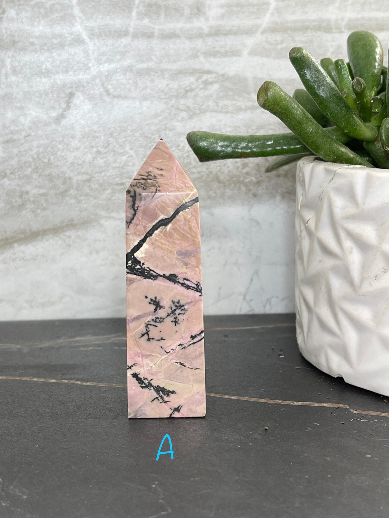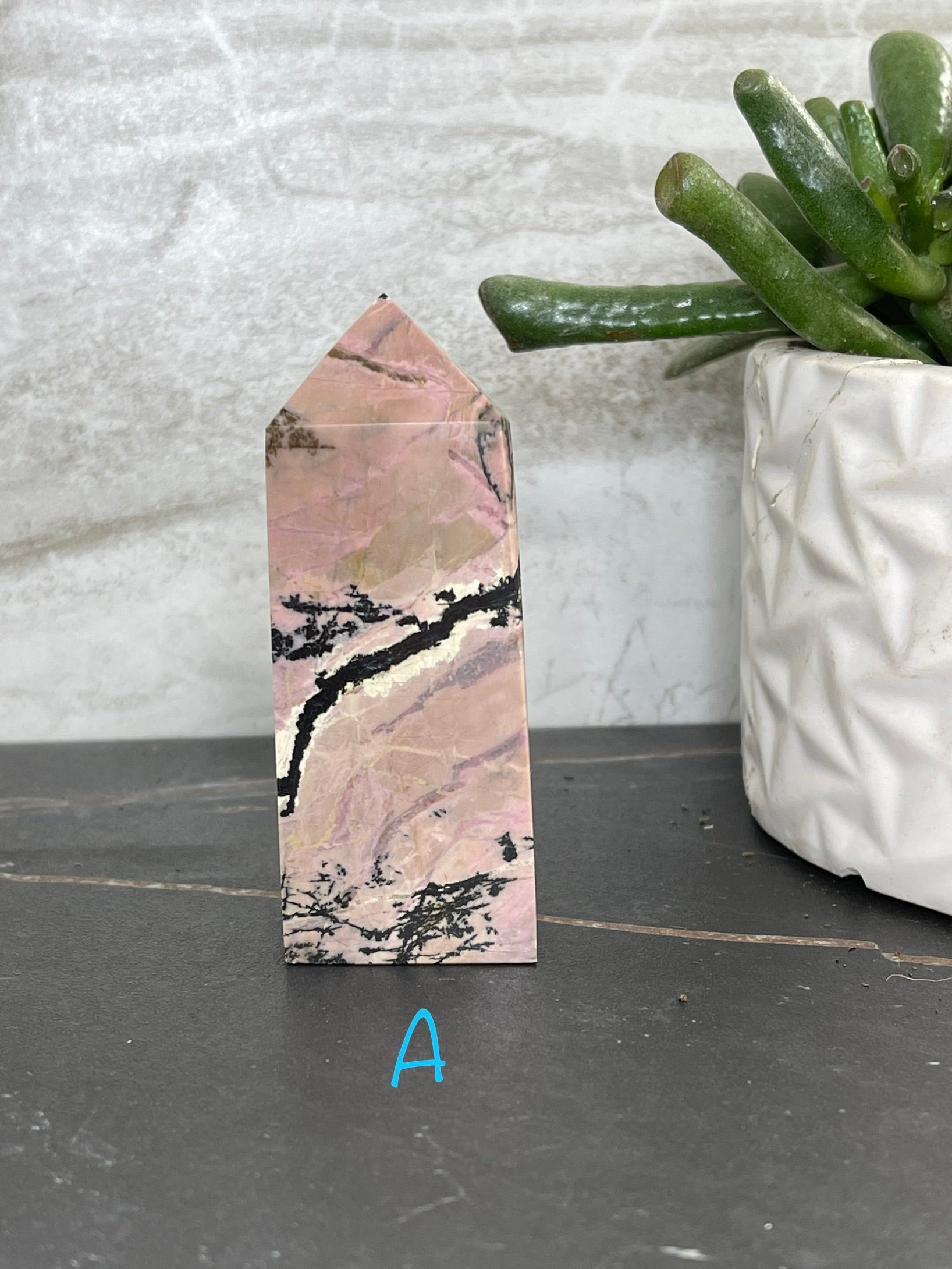 Rhodonite Points are the perfect accompaniment to any practice of self-care. This unique stone of compassion balances emotions and clears away past trauma, allowing for true healing and the potential for love. With its ability to ground energy, balance yin-yang, and activate the heart chakra, Rhodonite facilitates achieving one's highest potential. It is a fantastic tool for relieving emotional shock and panic. The Rhodonite Points measure approximately 3 ¼ in. tall and 1 ¼ in. wide.