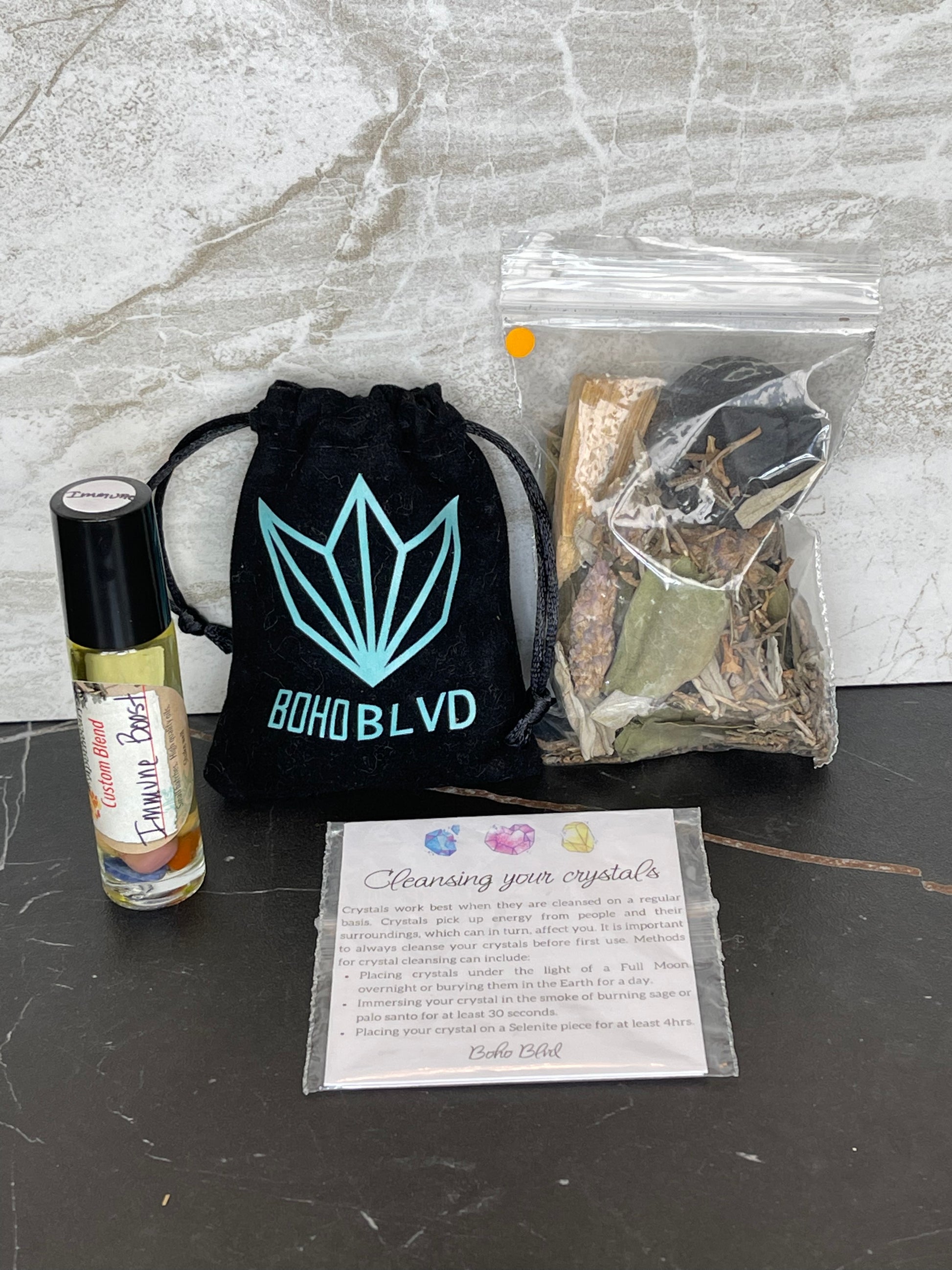 Immune boost kit. This kit includes 5 crystals, hand made curated loose smudge, informational cards and custom essential oil. The crystals and smudge are geared to helping with fever, building of immune system and cleansing of your space.  The essential oil Immune Boost is a blend to help boost your immune system.  The crystals in the oil blend help with attracting a diagnosis and to help with after surgery as well.