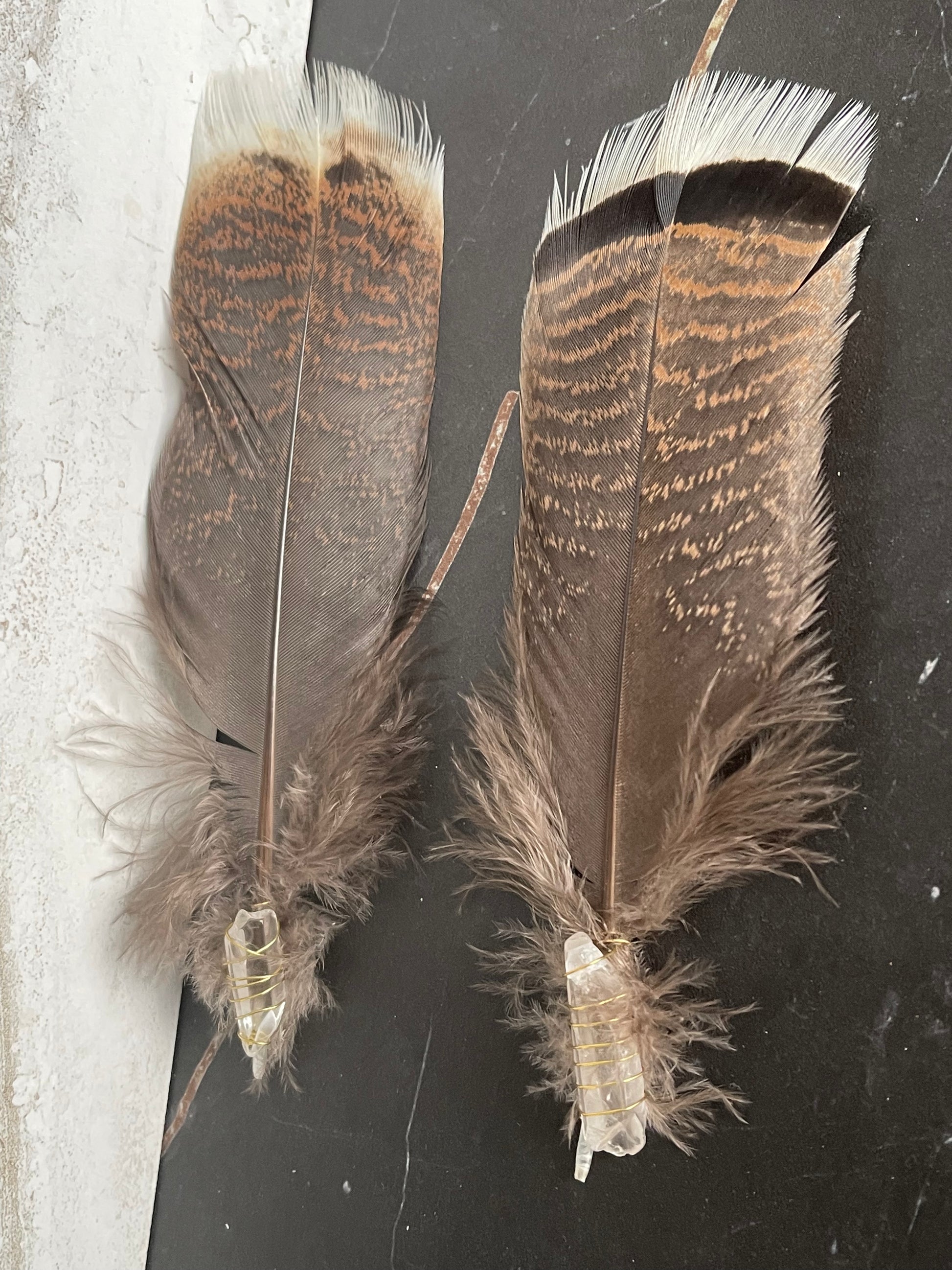 These are tail feathers for smudging, wire wrapped with either Clear Quartz, or Kyanite crystals.