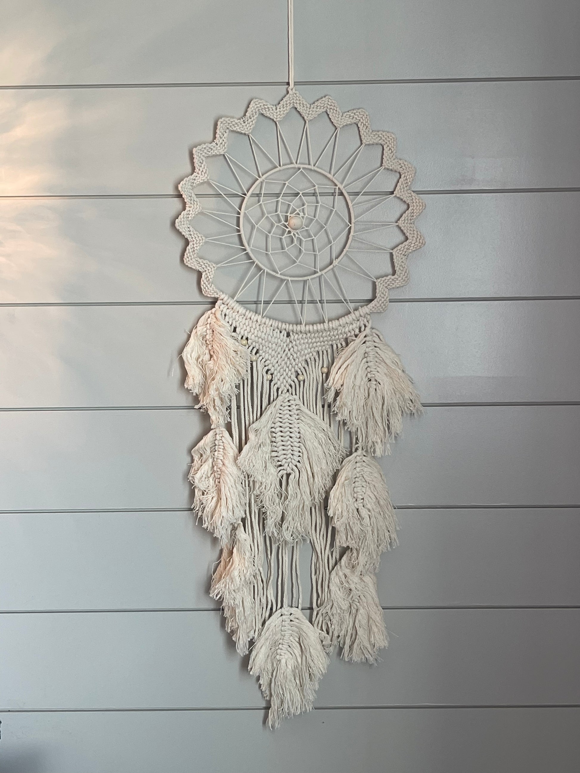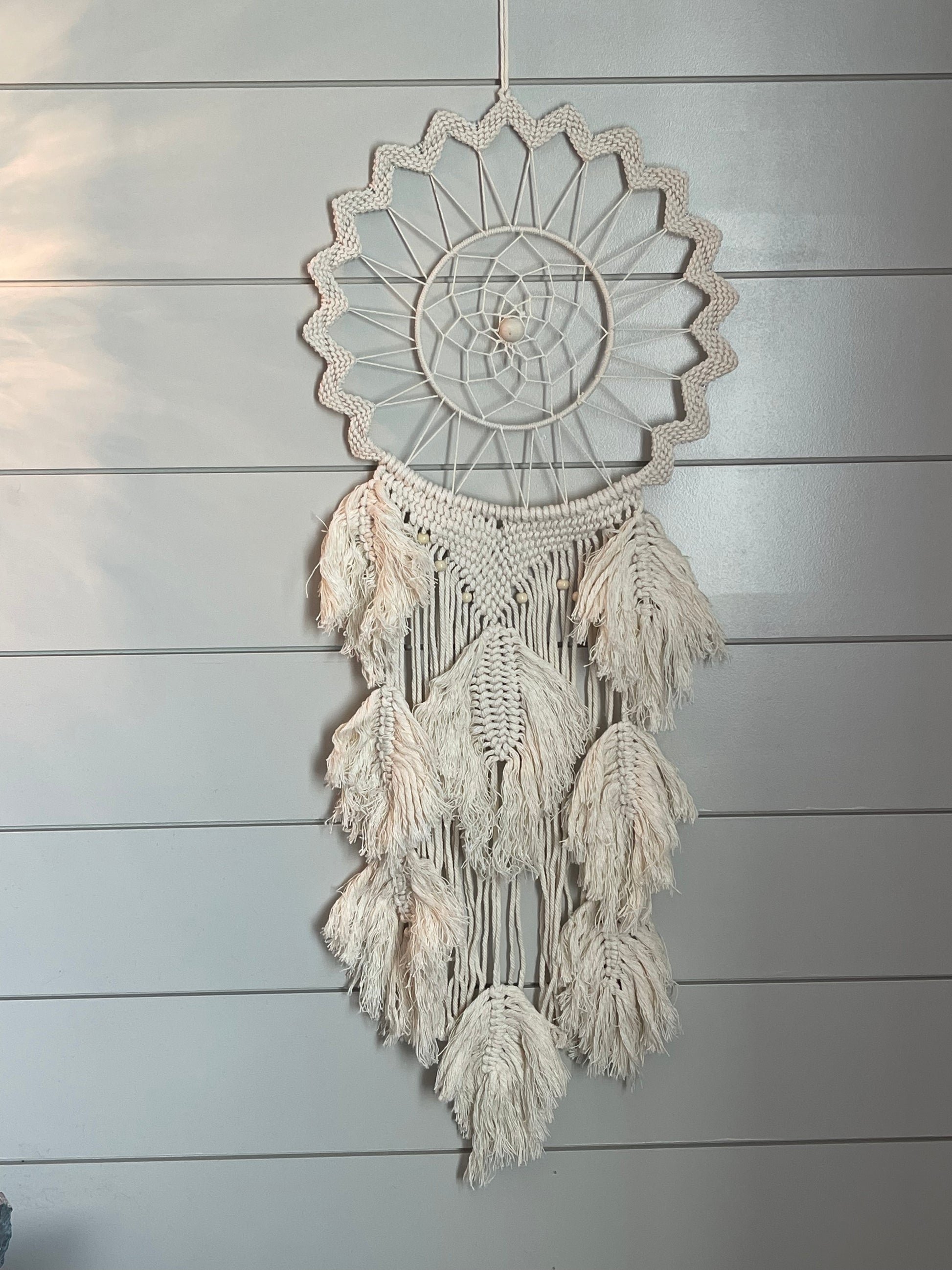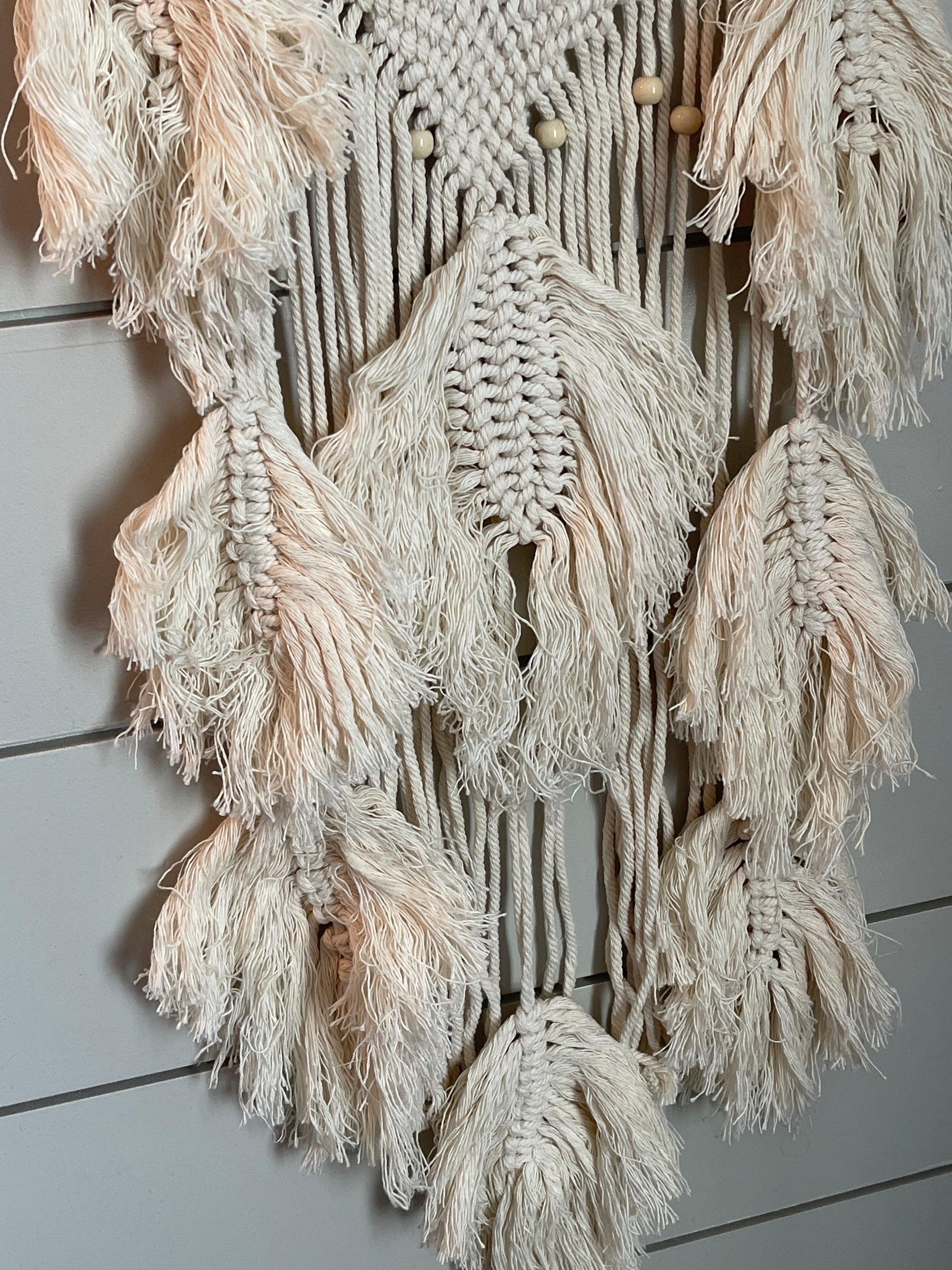 Beautifully crafted macrame dreamcatcher.  Fine detail, and the perfect simple boho accent to your decor.