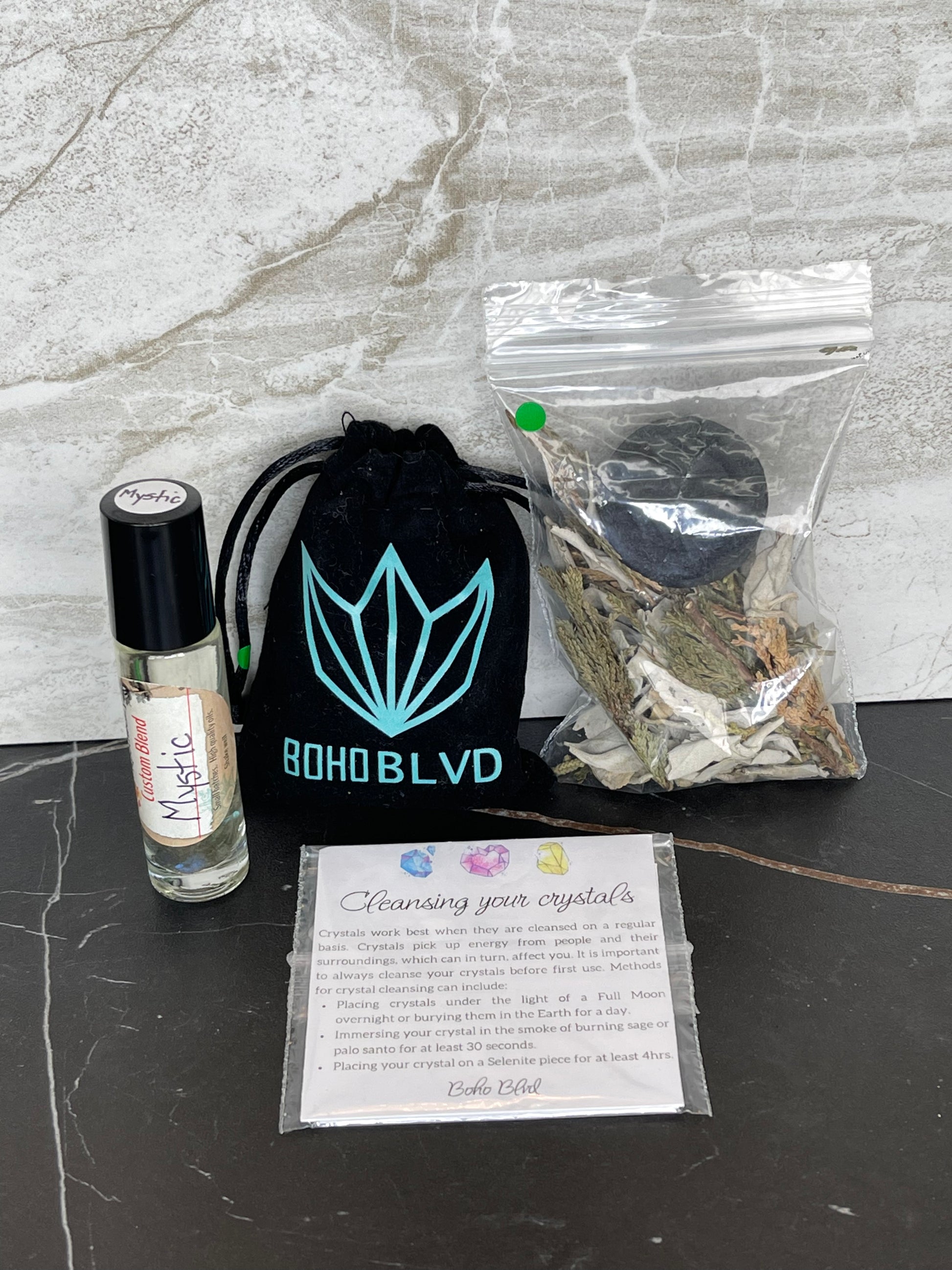 Starter kit is a good foundation to start with when being introduced to working with crystals, smudging and just energy in general. This kit includes 5 crystals, curated loose smudge, informational cards on the crystals and custom essential oil.  Use the smudge to clear your space, use the roller ball essential oil Psychic Shield on yourself to help your practice of shielding psychic and auric attachments, also helps when feeling bombarded by others energy. Learn about each new crystal and carry the one that has the benefits you feel you’re needing that day, switching out as needed.