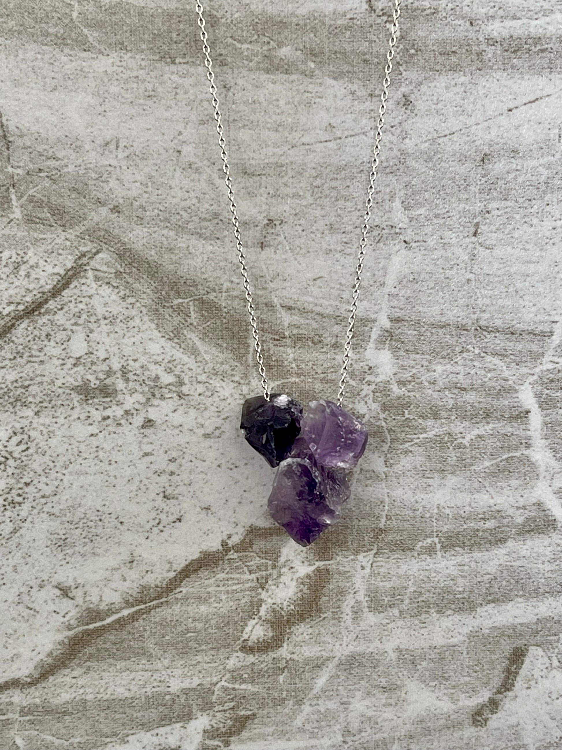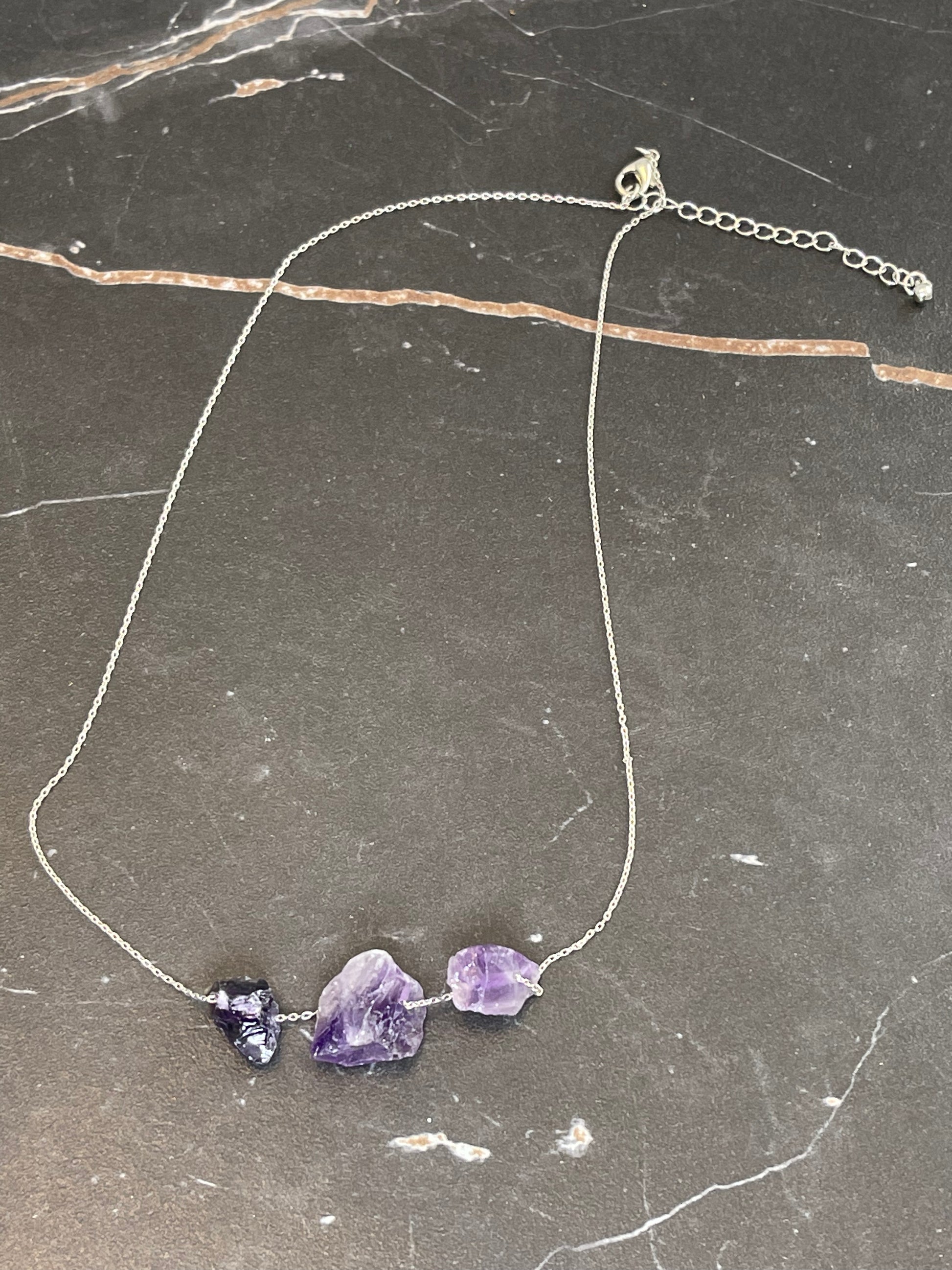 This Three Stone Amethyst Necklace is crafted with three stunning amethyst stones on a classic silver chain. Amethyst is known to bring healing, strength, and courage to its wearer, making it the perfect addition to any jewelry collection.