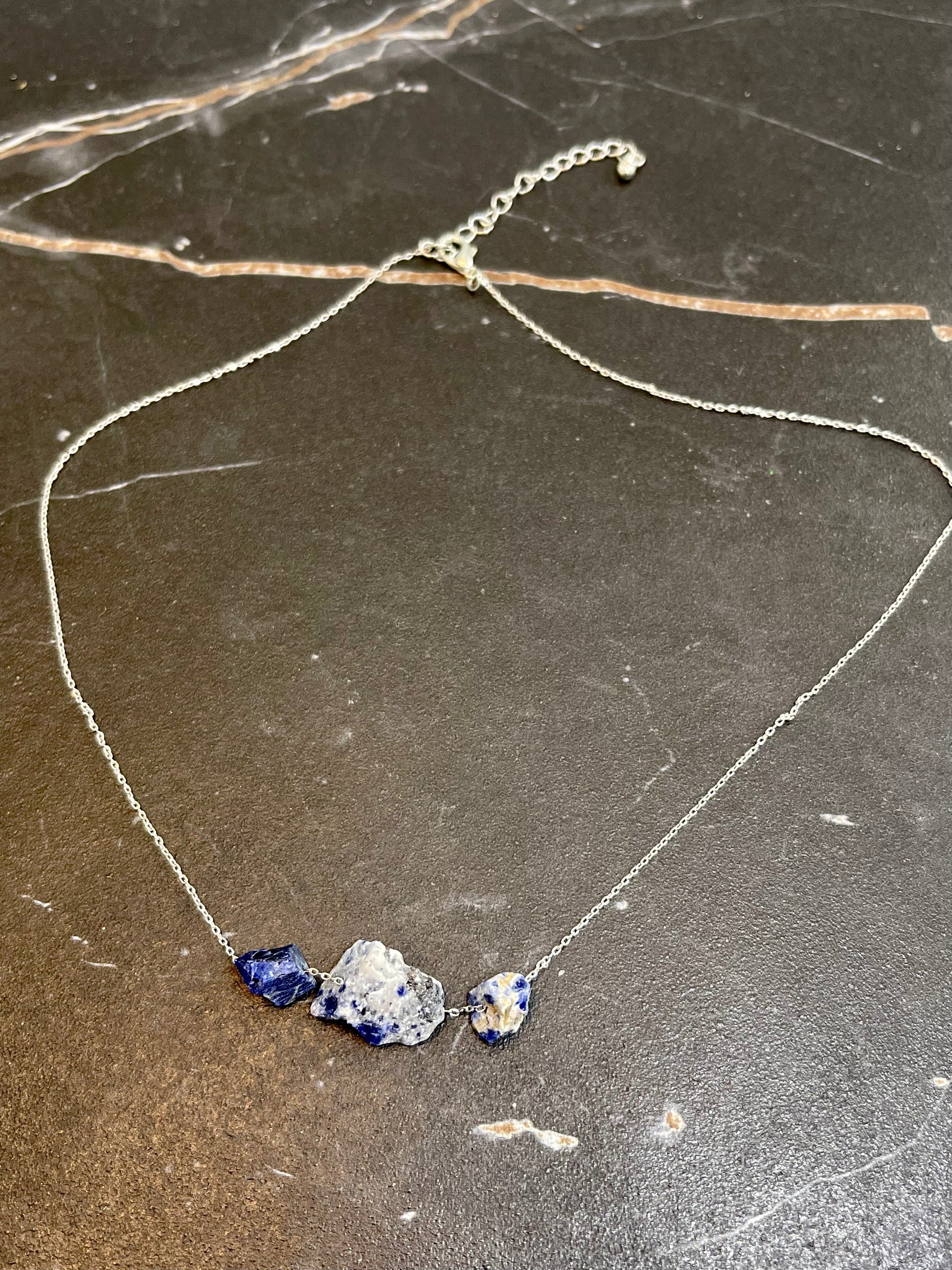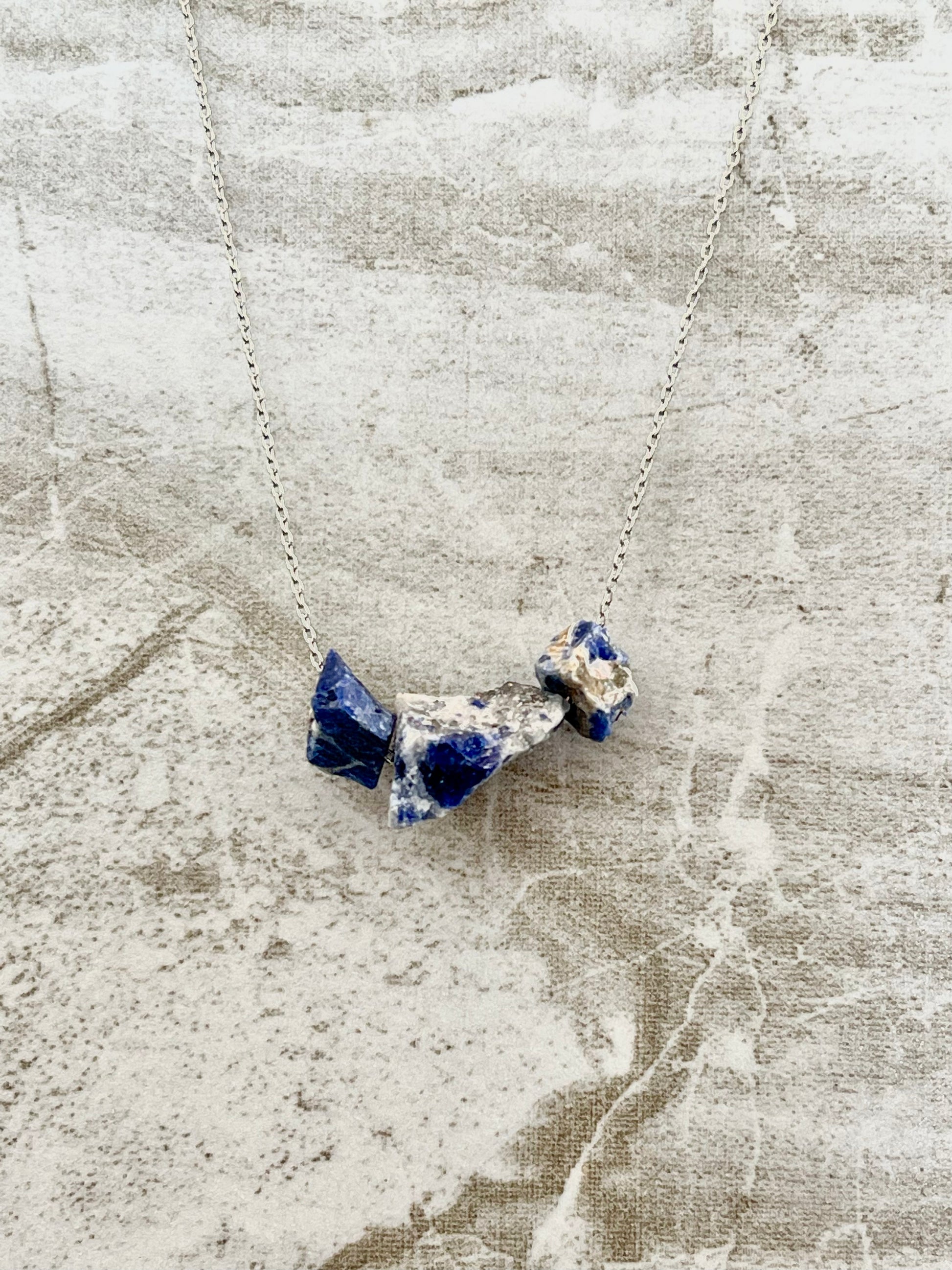 Treat yourself to this stylish three stone Sodalite Necklace. The adjustable length chain allows for versatile styling so you can wear it in a variety of ways. Crafted from a beautiful combination of Sodalite gemstones, this necklace will certainly be a statement piece.