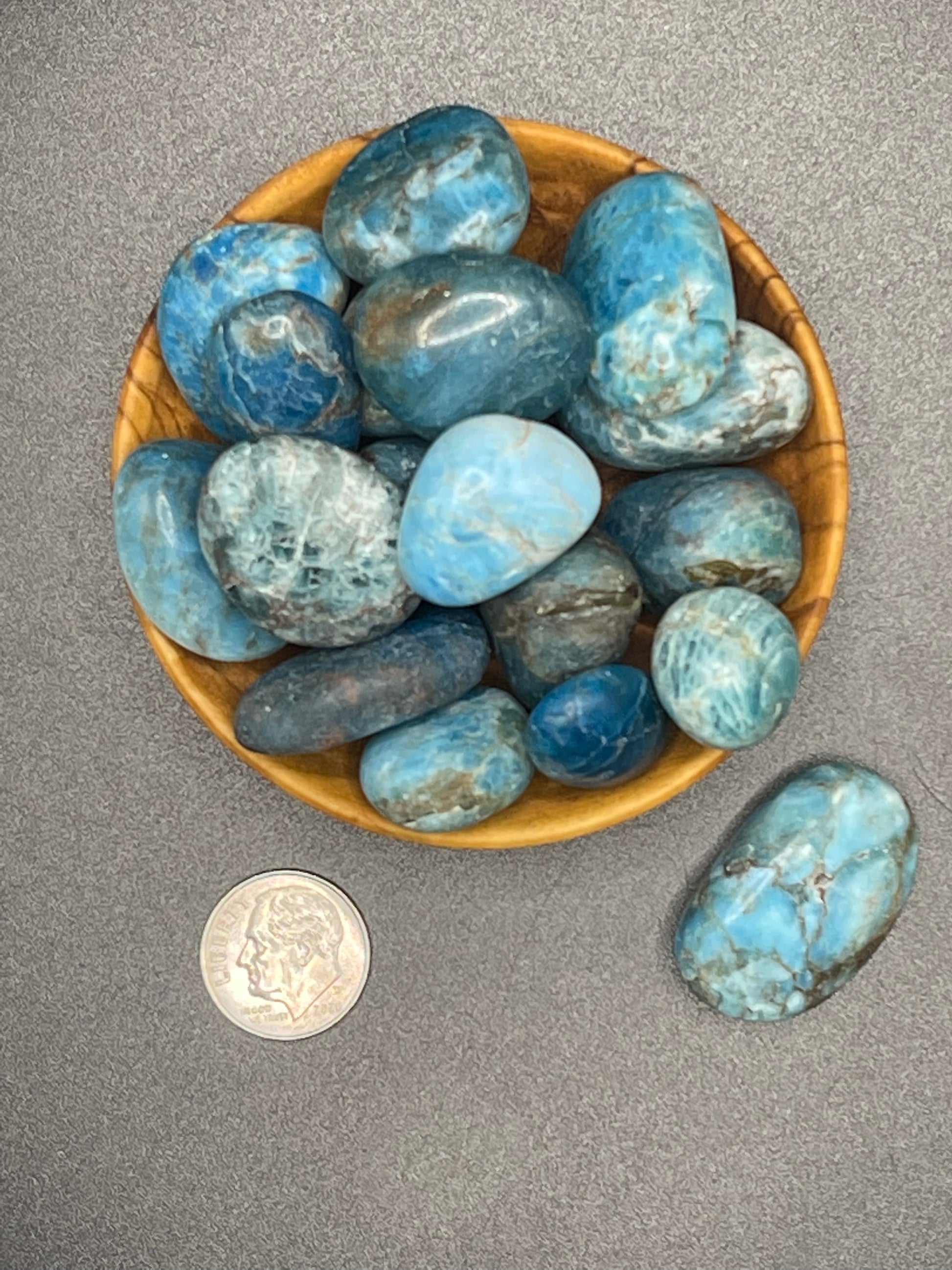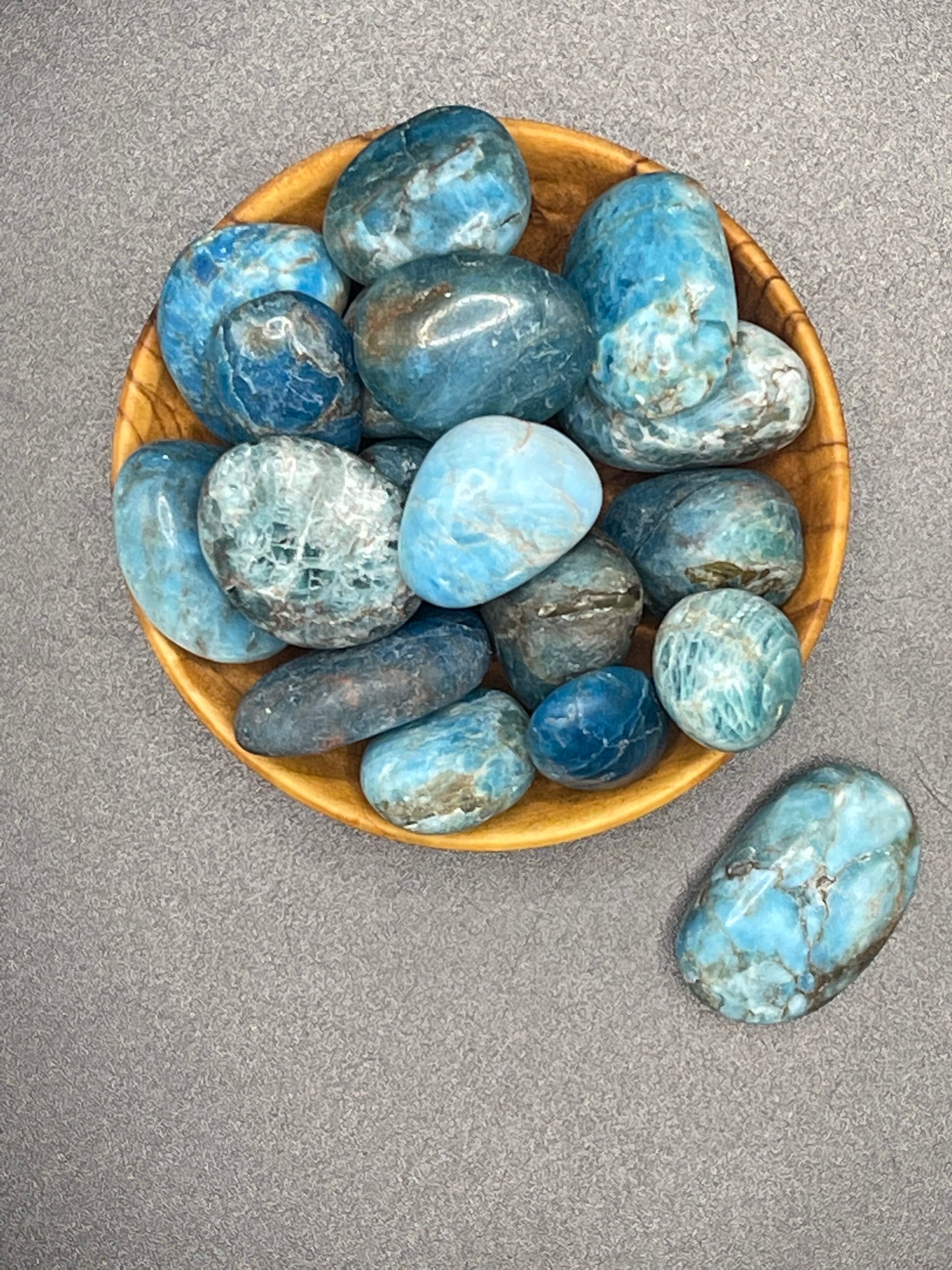 Blue apatite helps with motivation, ambition, self confidence and self-acceptance.  Connects to a very high level of spiritual guidance.  It facilitates public speaking, enhances group communication, opens the throat chakra and heals the heart and emotional issues.