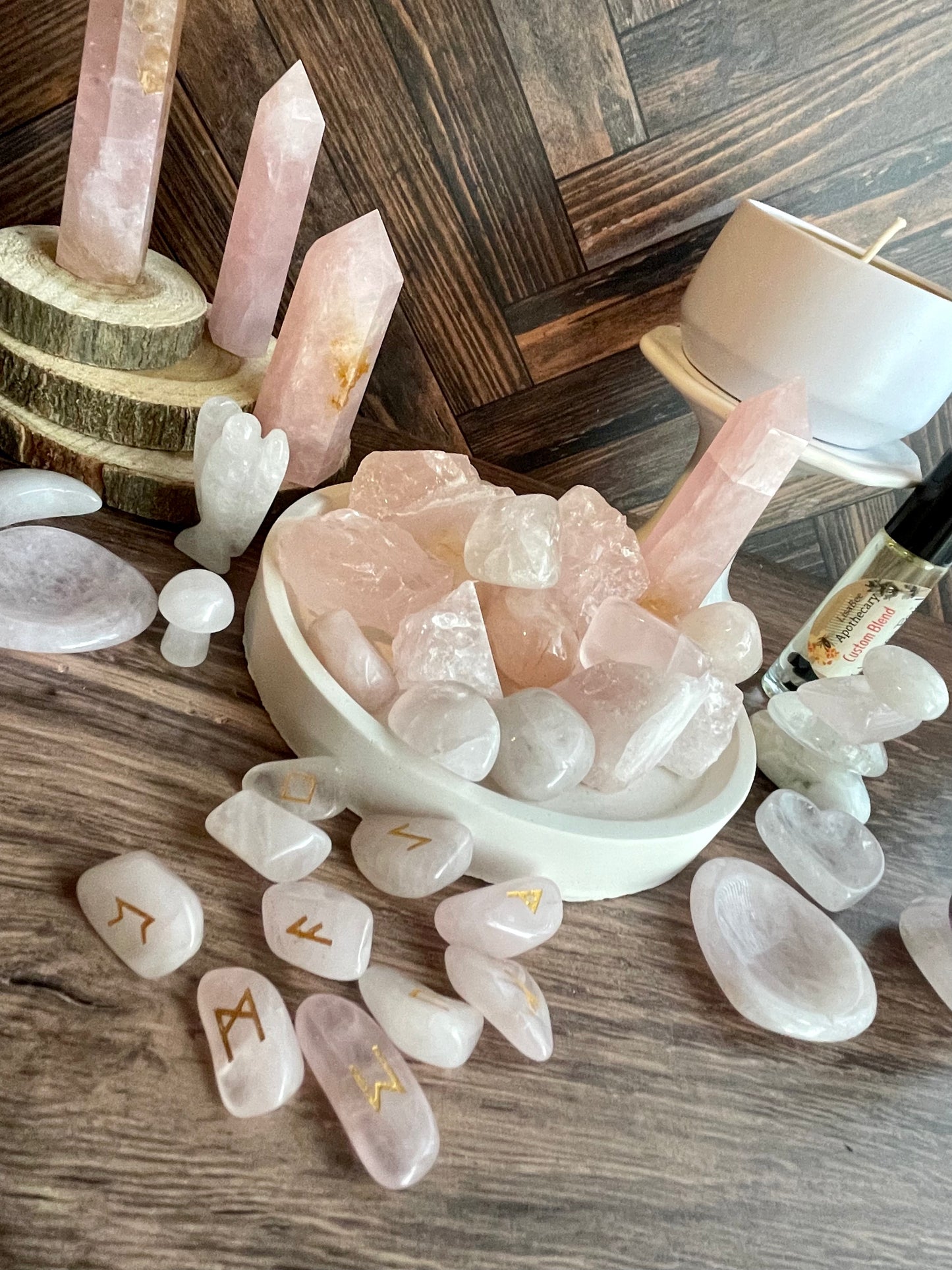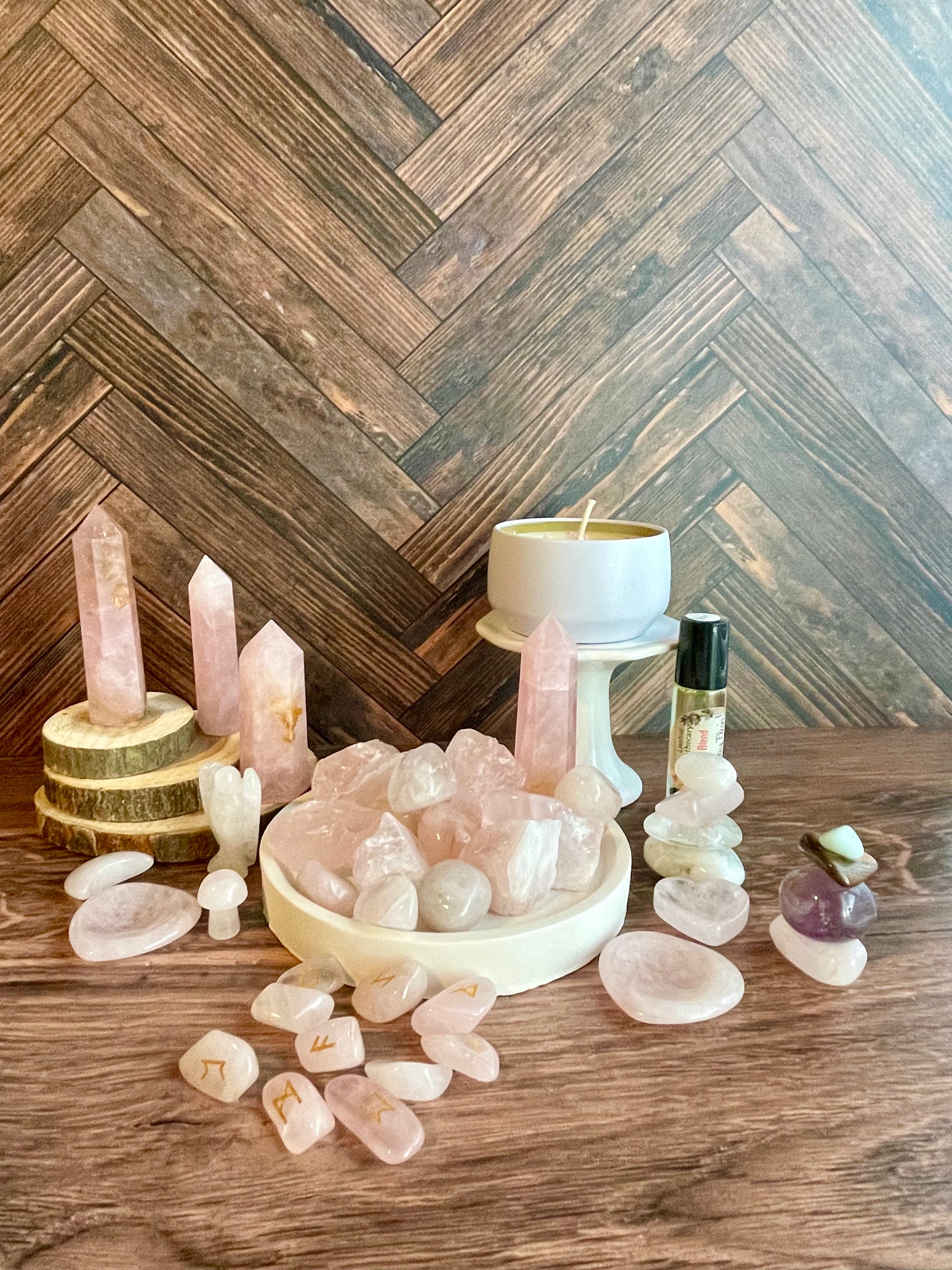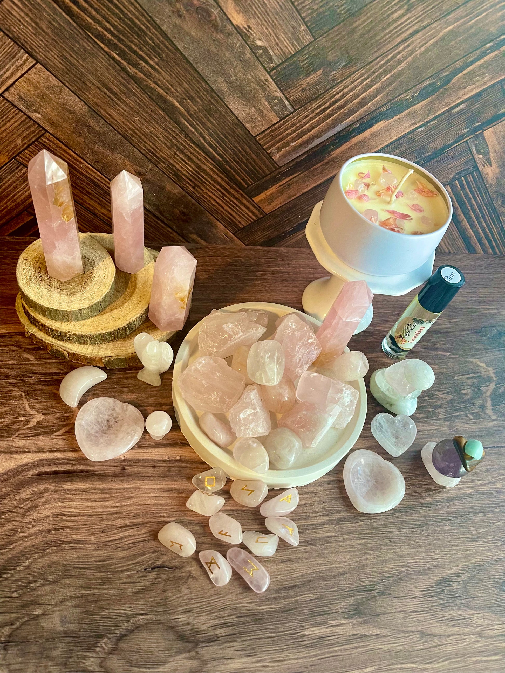 Rose quartz can be used to balance emotional health, release emotional blockages and balance chakras.  Strengthens the physical heart and circulatory system.  Help heal kidneys and alleviate vertigo.  Soothes burns and blistering.  Can gently draw off negative energy and replace with loving vibes.