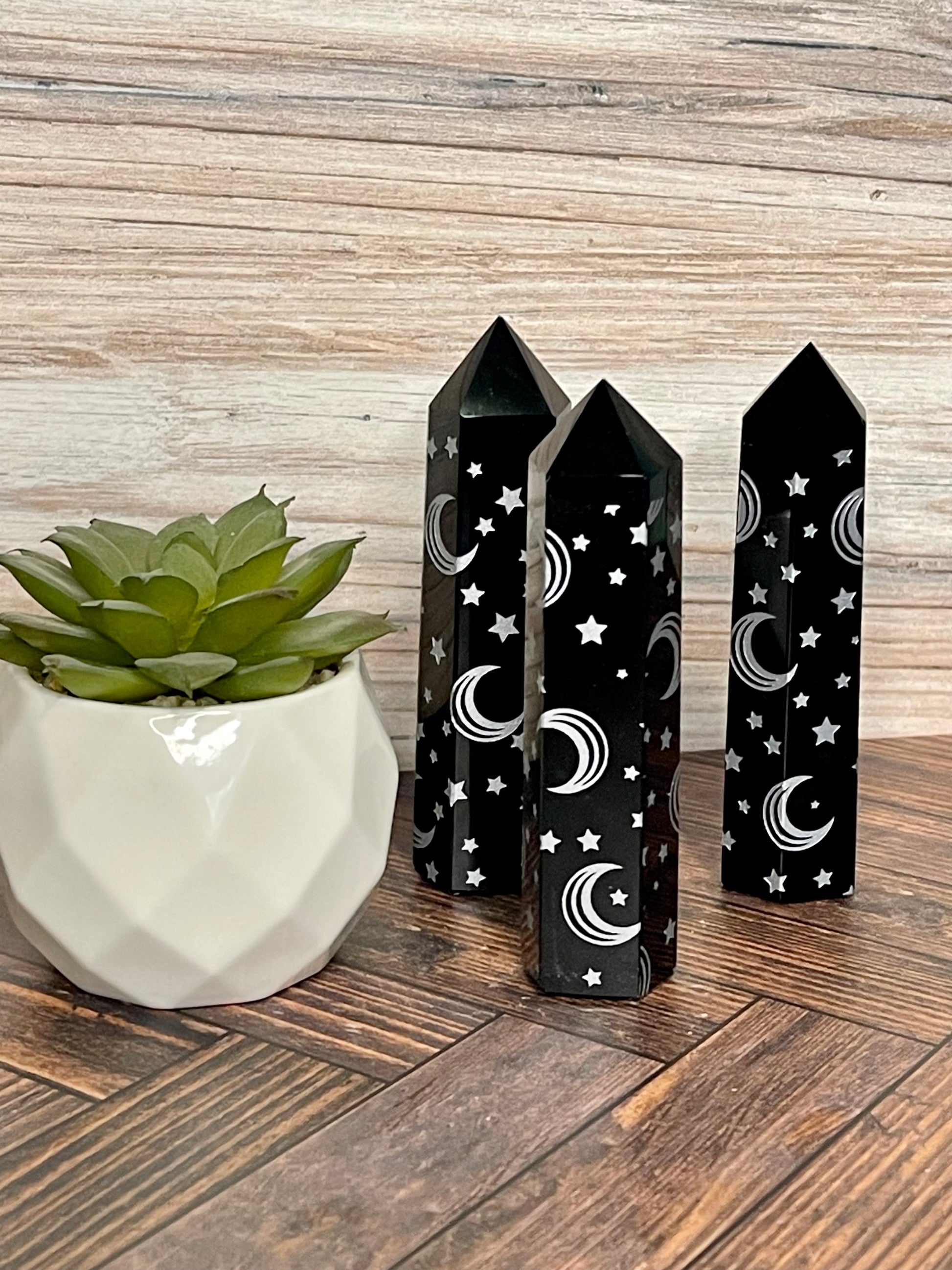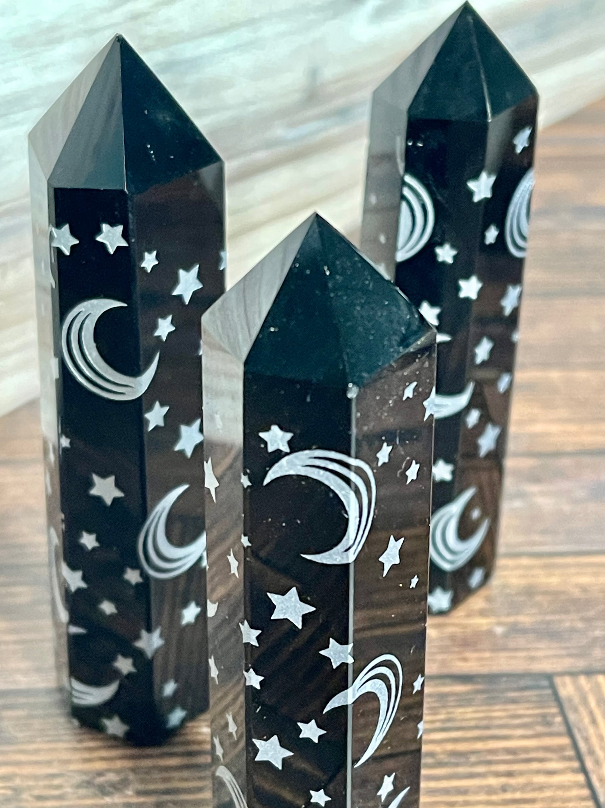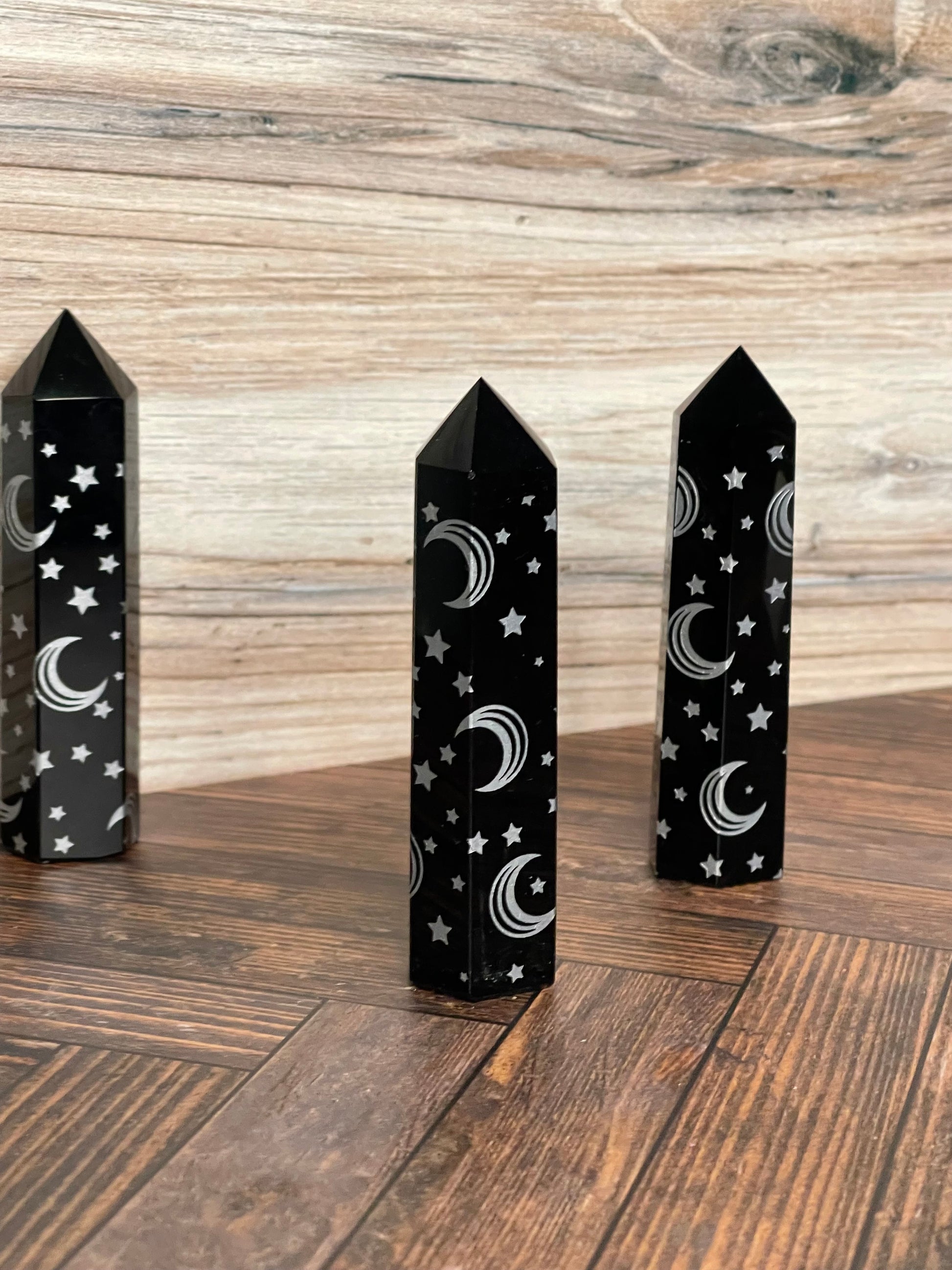 Experience the cosmic power of these Black Obsidian Points with Moons and Stars! Each stone is imbued with the night sky, so you can feel the heavenly power of the stars and moons by your side! (Cosmic vibes not guaranteed).